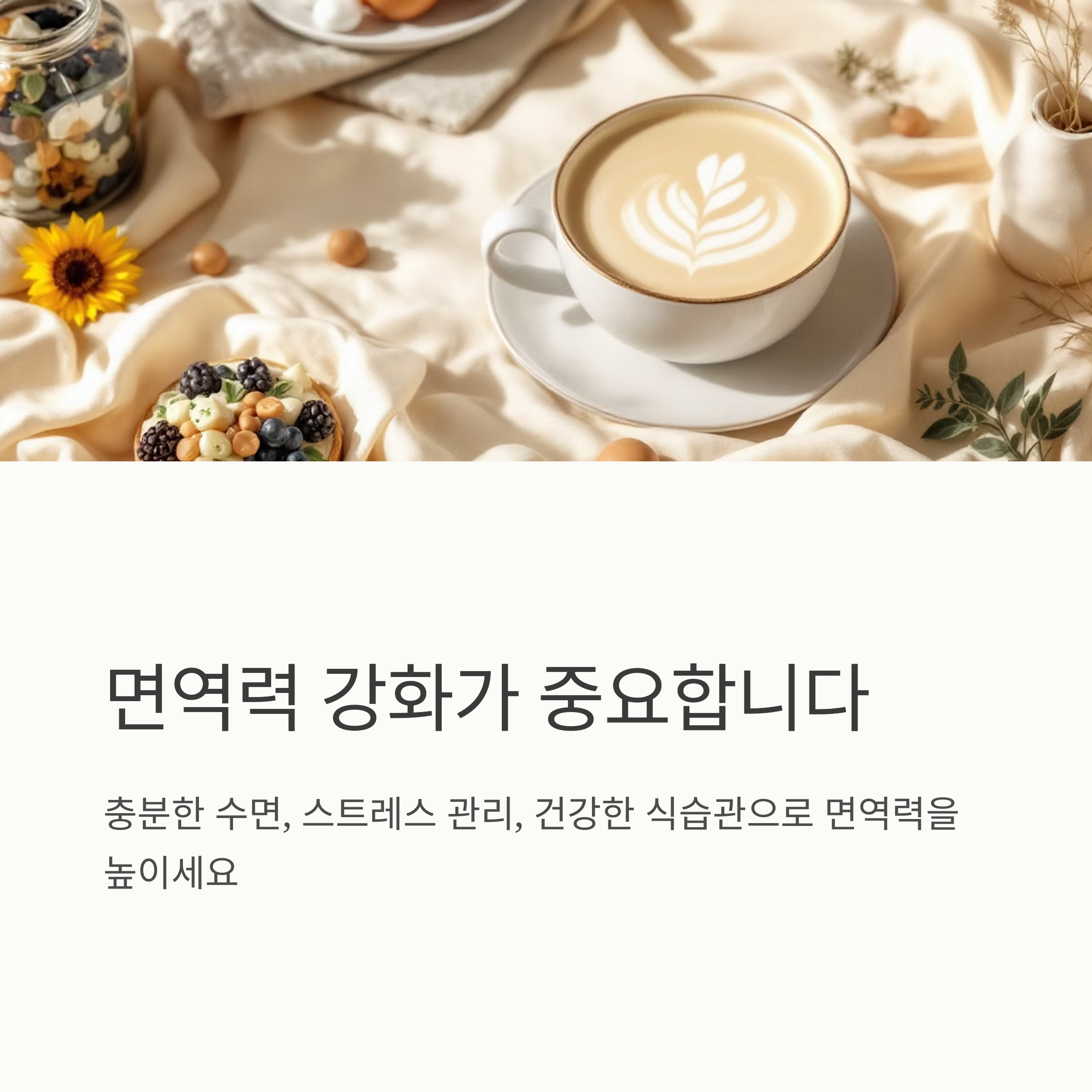 스트레스는 면역력을 떨어뜨리므로 스트레스 관리에도 신경 쓰는 것이 좋습니다. 그리고 당뇨병과 같은 만성 질환이 있다면, 혈당 관리를 철저히 해야 합니다. 혈당 관리가 잘 되지 않으면 면역력이 떨어져 감염에 취약해지거든요. 평소 몸에 이상이 느껴진다면 병원을 방문하여 진료를 받는 것이 좋습니다.