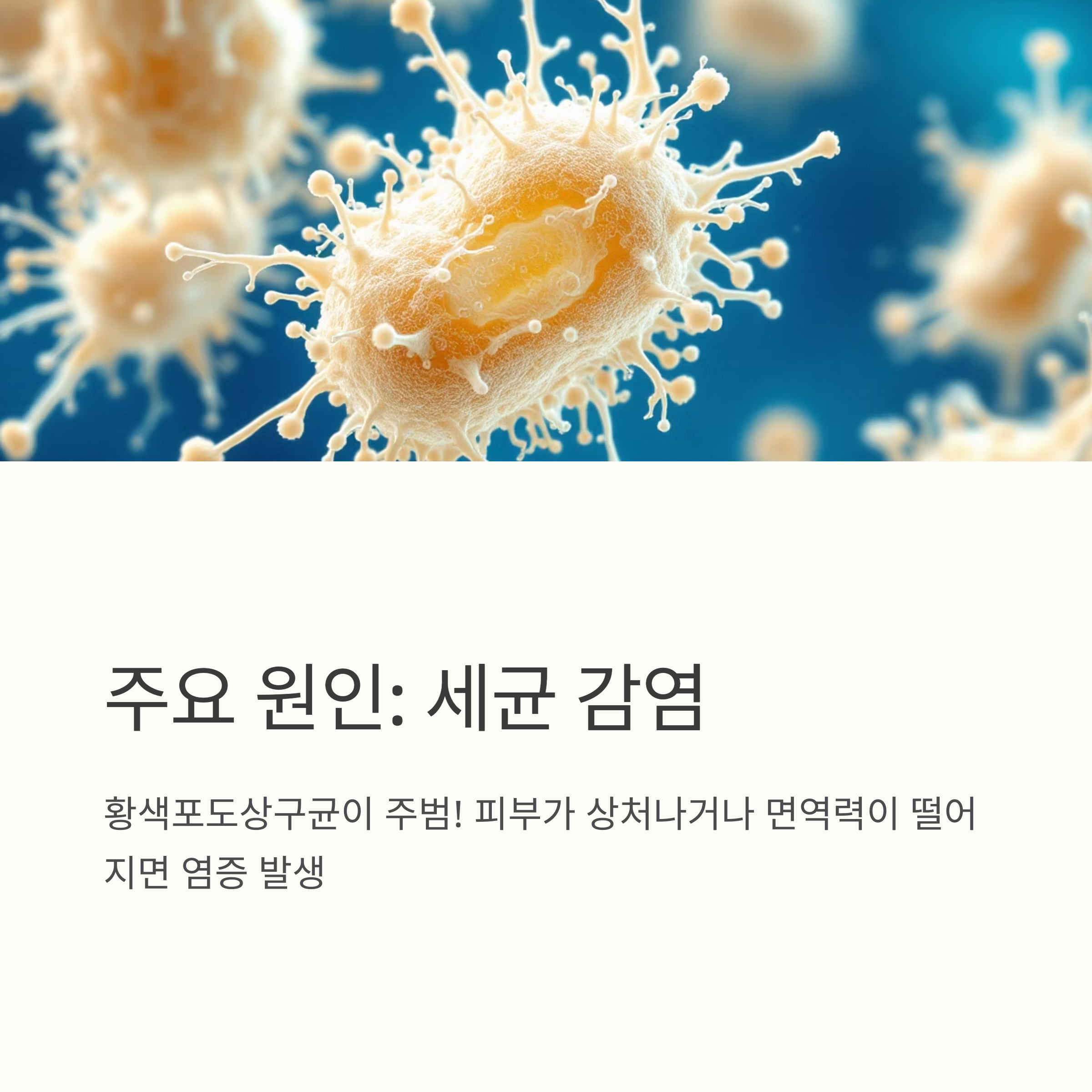 우리 피부에는 평소 괜찮은 세균들이 살고 있지만, 피부가 상처나거나 면역력이 떨어지면 이 세균들이 염증을 일으키거든요. 특히 황색포도상구균이라는 녀석이 종기의 주범으로 알려져 있어요. 여기에 당뇨병처럼 면역력이 떨어지는 질환이 있다면 더욱 종기가 생기기 쉬워지고요. HIV/AIDS나 면역억제제를 복용하는 경우에도 마찬가지예요.