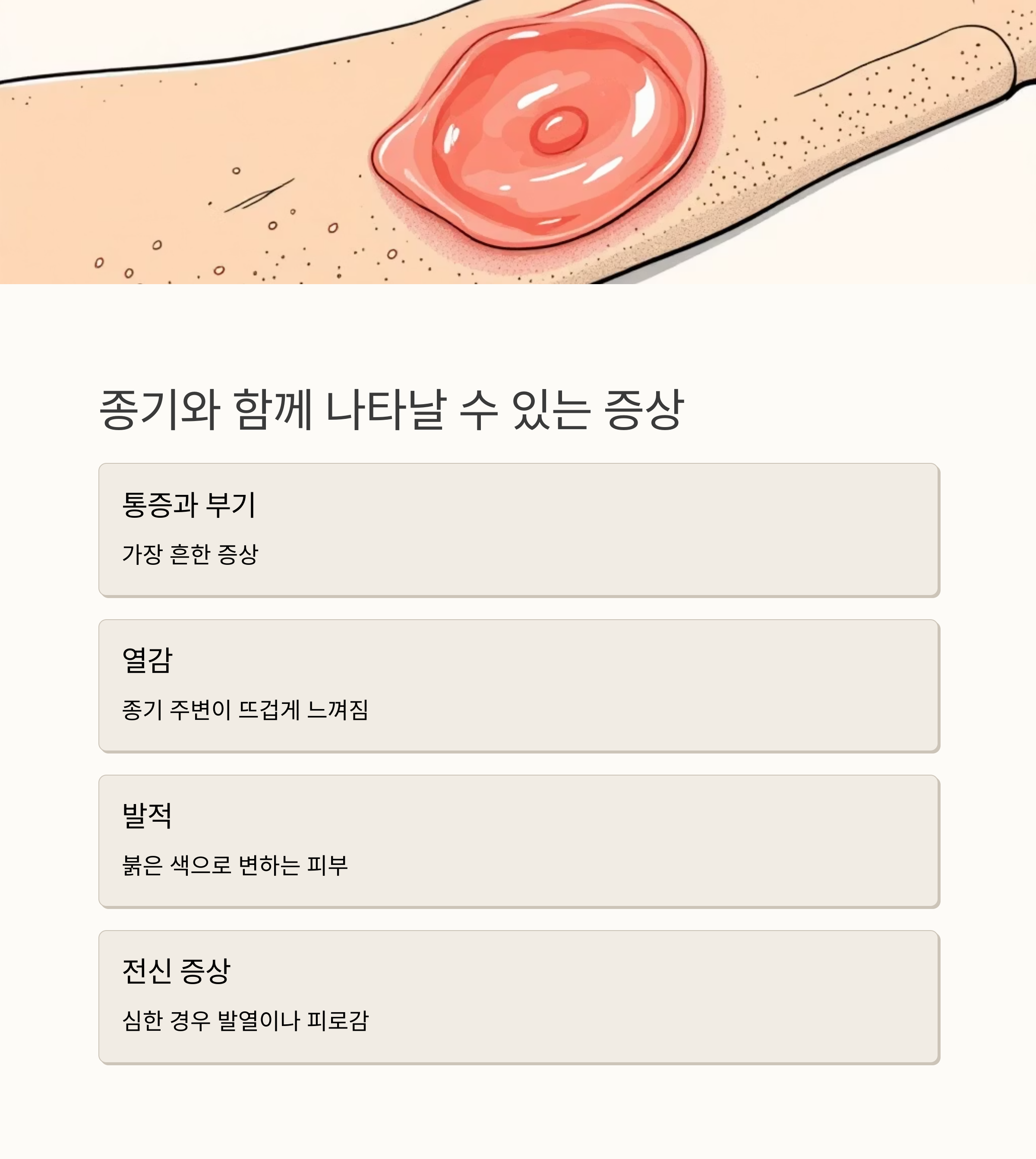 만약 종기가 작고 통증이 심하지 않다면, 따뜻한 물에 적신 수건으로 온찜질을 해주는 것도 방법이에요. 하루에 3-4번, 10-15분 정도 해주면 염증 완화에 도움이 될 수 있습니다. 통증이 심하다면 진통제를 복용할 수도 있지만, 의사와 상담 후 복용하는 것이 좋습니다.