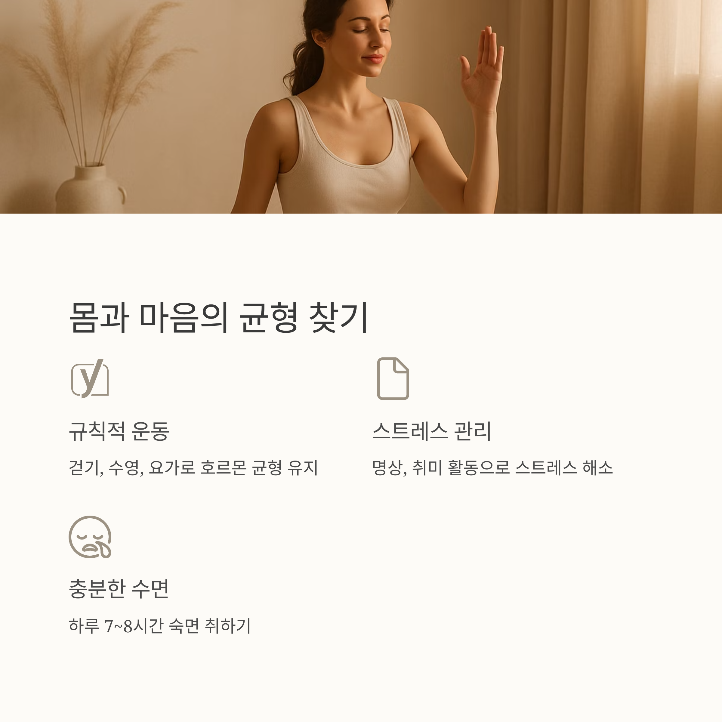 규칙적인 운동은 호르몬 균형을 맞추는 데 도움이 돼요. 격렬한 운동보다는 걷기, 수영, 요가처럼 자신에게 맞는 운동을 꾸준히 하는 게 중요해요. 운동은 스트레스 해소에도 좋고요. 스트레스는 호르몬 균형을 깨는 주요 원인 중 하나거든요. 명상, 요가, 취미 활동처럼 자신만의 스트레스 해소법을 찾아보세요.
