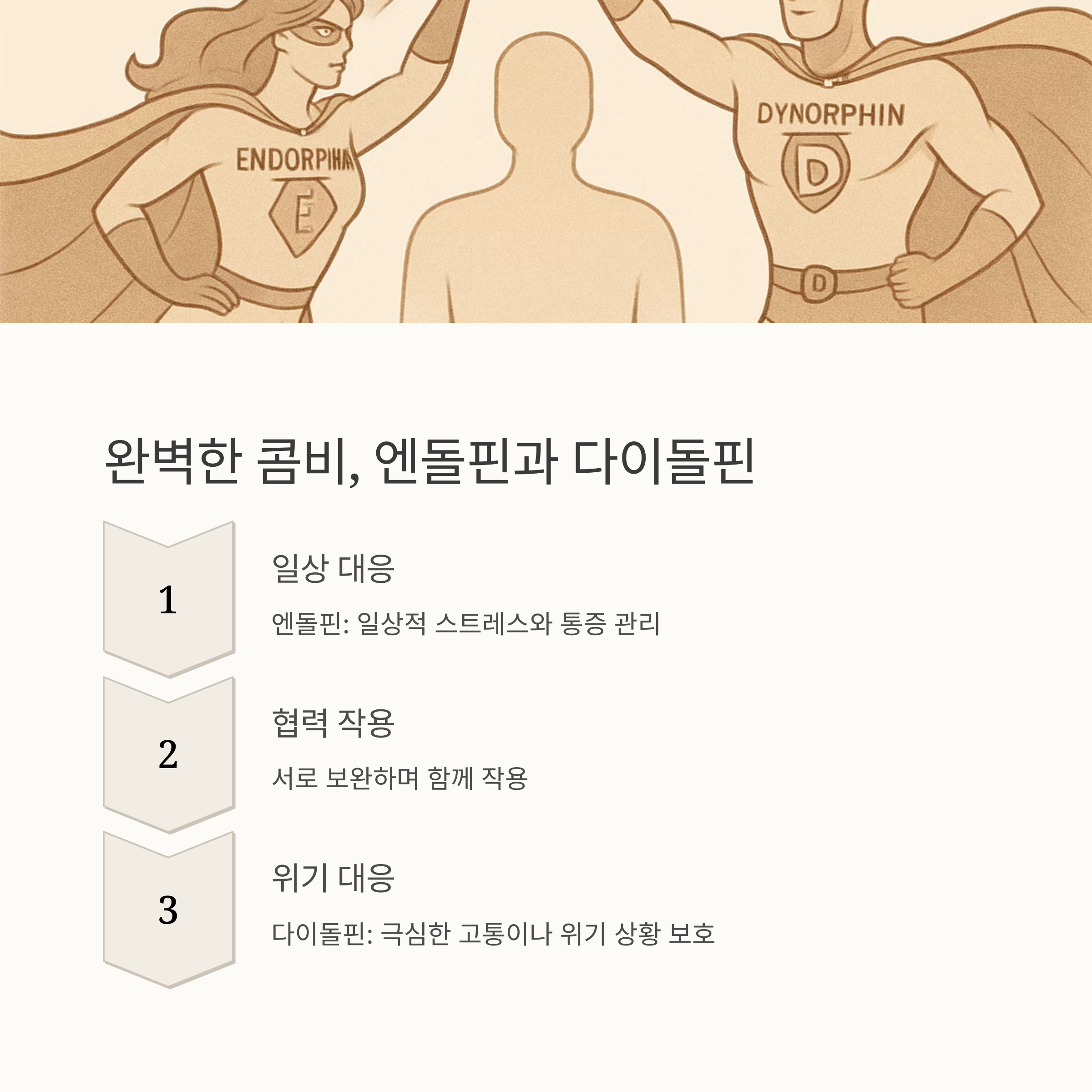 특별한 능력을 가진 슈퍼히어로 팀처럼 말이죠. 이 팀원들이 힘을 합쳐 통증을 줄이고 기분을 좋게 만들어 주는 거예요. 운동을 하거나 웃으면 엔돌핀이 팡팡 터져 나온다고 하니, 오늘부터라도 규칙적인 운동과 웃음으로 엔돌핀 파티를 열어보는 건 어떨까요?