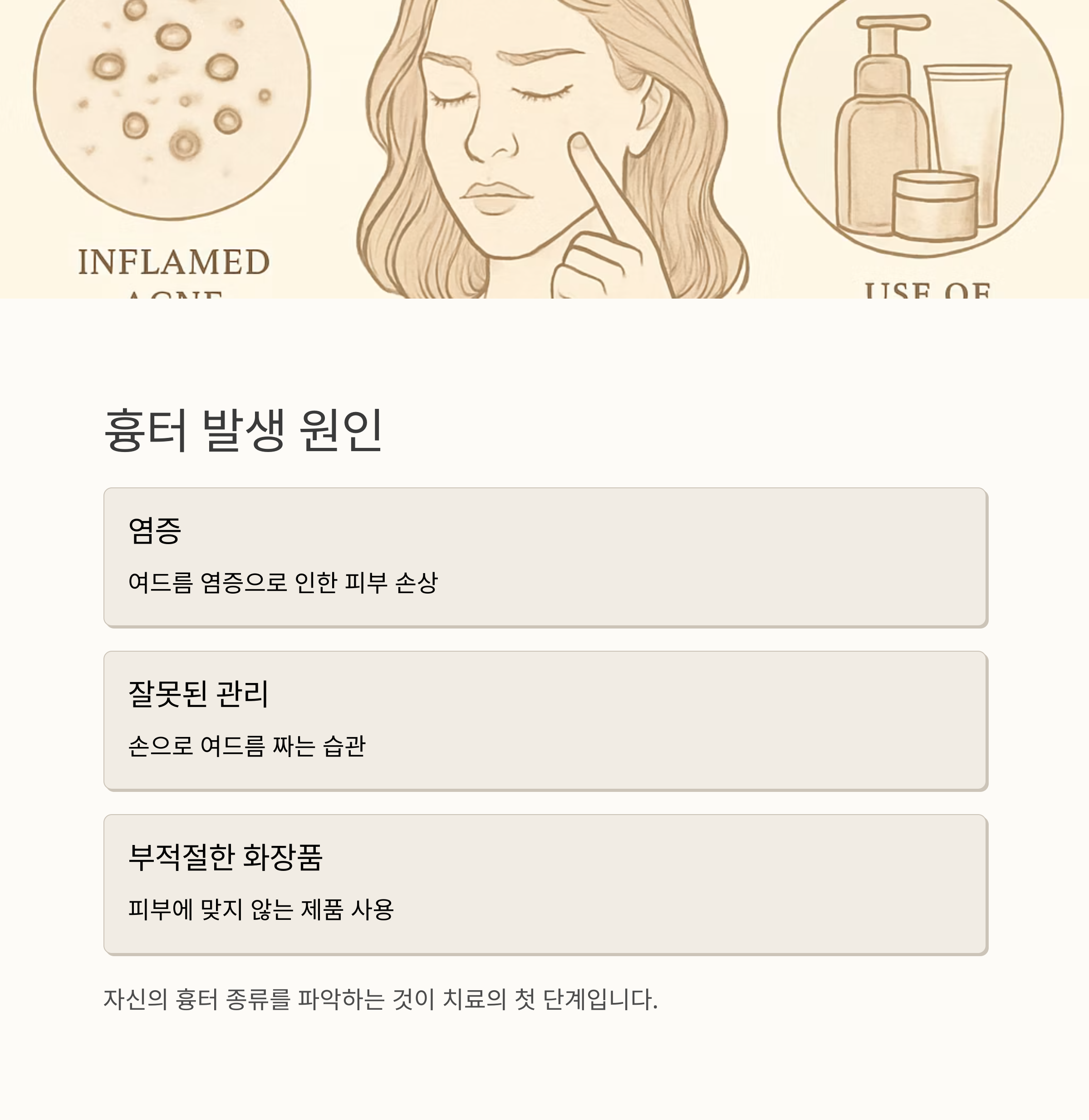 손으로 여드름을 짜는 습관이나, 잘못된 화장품 사용도 원인이 될 수 있고요. 자신의 흉터가 어떤 종류인지 아는 게 첫 번째 단계예요. 그래야 맞는 치료법을 찾을 수 있으니까요. 자신의 흉터 사진을 찍어서 피부과 의사 선생님께 보여주는 것도 좋은 방법이에요. 정확한 진단을 받아야 효과적인 치료를 할 수 있답니다!
