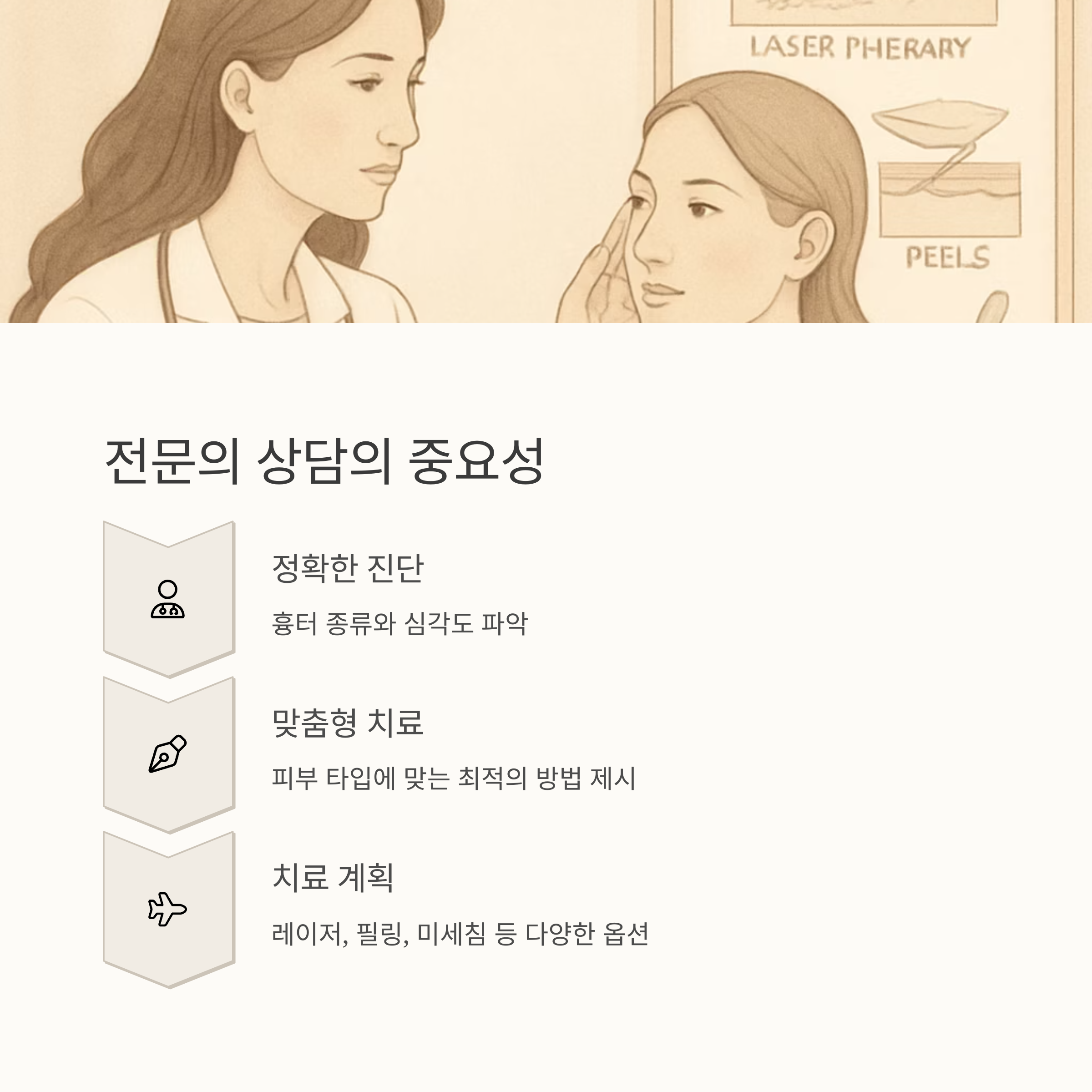 여드름 흉터 치료는 무작정 시작하면 안 돼요. 피부과 전문의와 상담을 통해 나에게 맞는 여드름 흉터 없애는 법을 찾는 것이 가장 중요해요. 의사 선생님은 흉터의 종류와 심각도, 피부 타입 등을 고려하여 최적의 여드름 흉터 없애는법을 제시해 줄 거예요.