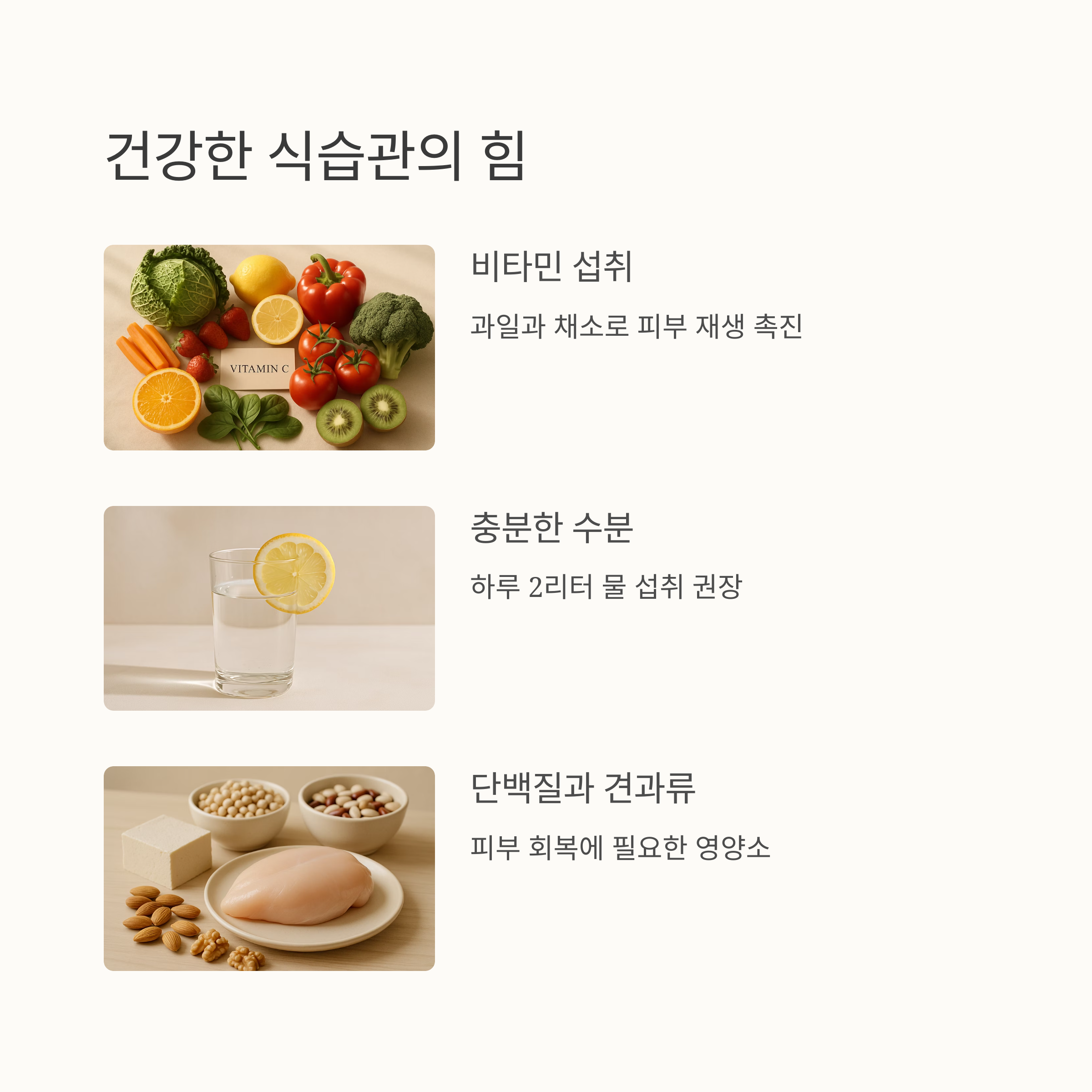 여드름 흉터 개선에는 식습관도 중요한 역할을 해요. 피부 건강에 좋은 영양소가 풍부한 음식을 섭취하는 게 좋아요. 비타민C가 풍부한 과일이나 채소를 많이 먹고, 단백질 섭취도 신경 쓰세요. 저는 샐러드나 과일을 자주 먹으려고 노력하고 있고, 평소 좋아하는 견과류도 꾸준히 섭취하고 있어요.