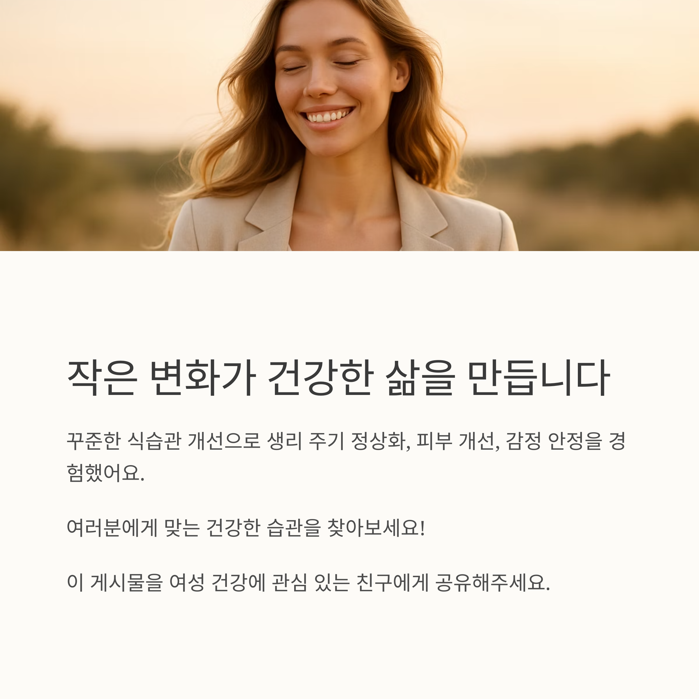 여러분에게 맞는 건강한 식습관을 찾아 꾸준히 노력해보세요. 여러분의 건강한 삶을 응원합니다! 제가 소개한 음식들을 본인의 식습관에 맞춰 적절히 활용하면서 건강한 여성 호르몬을 유지해 보시기 바랍니다. 작은 변화가 모여 건강하고 행복한 삶을 만들어갈 수 있다는 것을 잊지 마세요! 저는 앞으로도 건강한 식습관과 생활 습관을 유지하며 건강한 삶을 이어나갈 계획입니다.