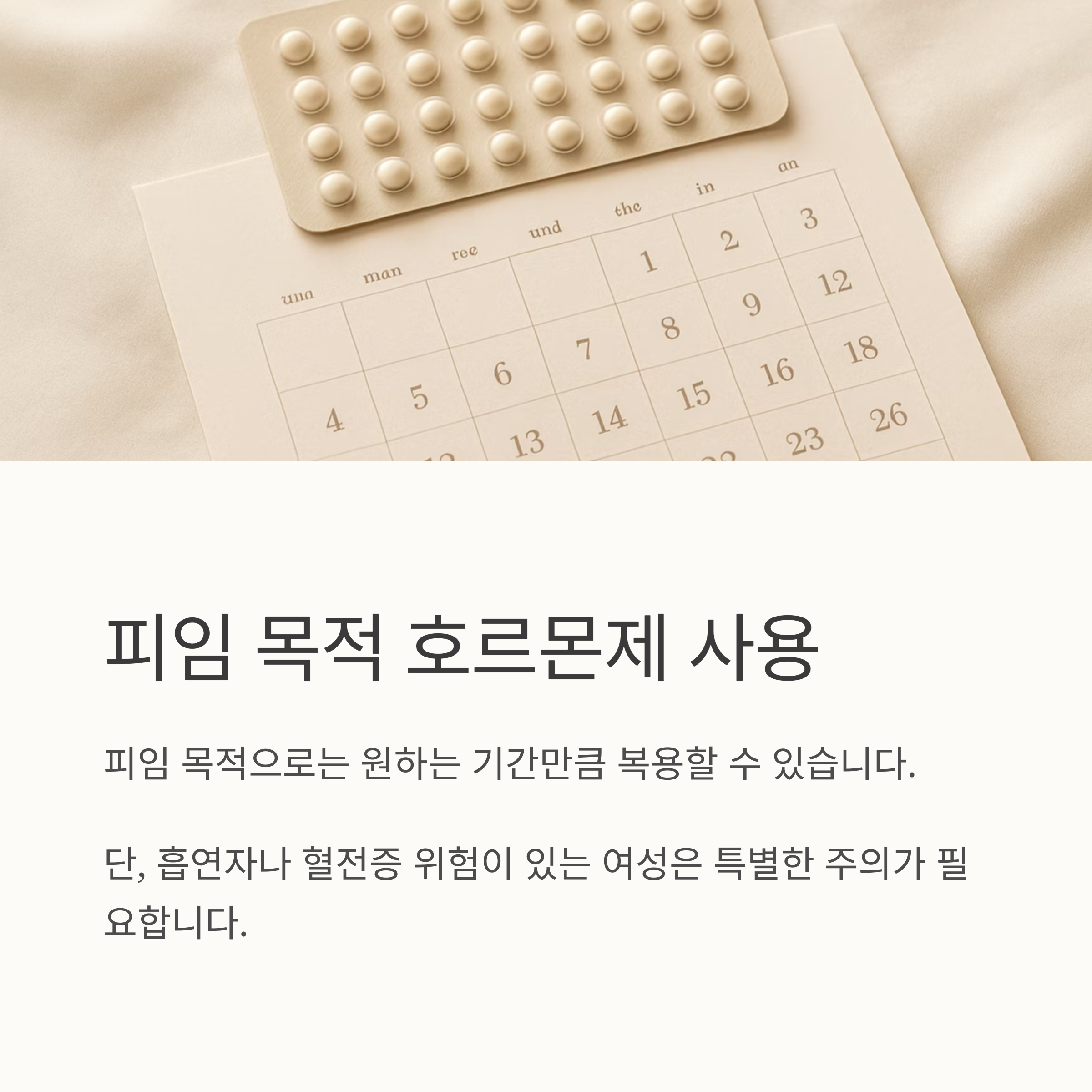 피임 목적이라면 원하는 기간만큼 복용할 수 있지만, 특히 흡연 여성이나 혈전증 위험이 있는 여성은 주의가 필요해요. 그리고 여성호르몬제의 부작용은 다양하게 나타날 수 있으니, 정기적인 검진과 전문가와의 상담은 필수입니다. 부작용이 나타나면 즉시 전문가와 상담해서 필요한 조치를 취해야 해요.