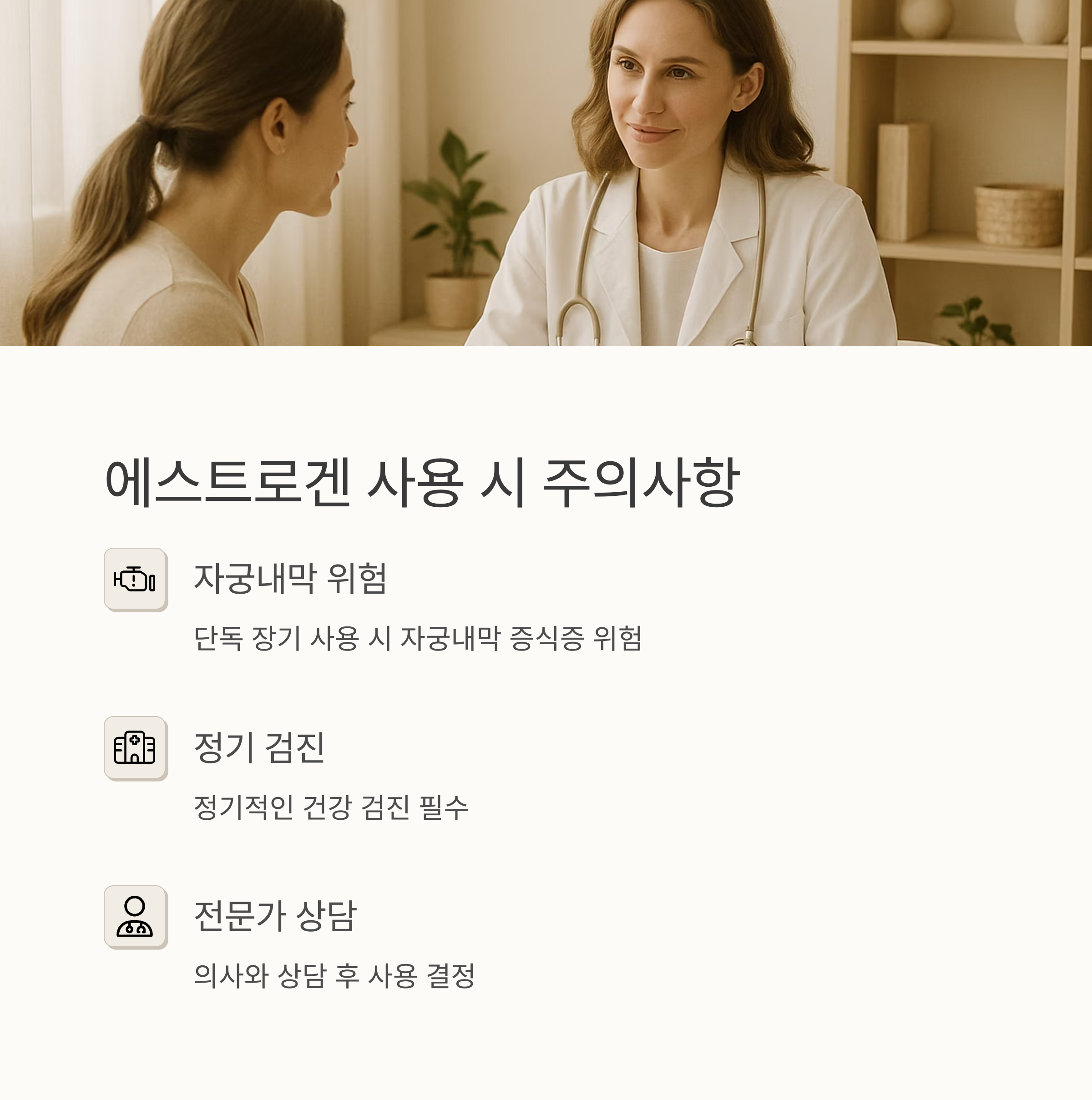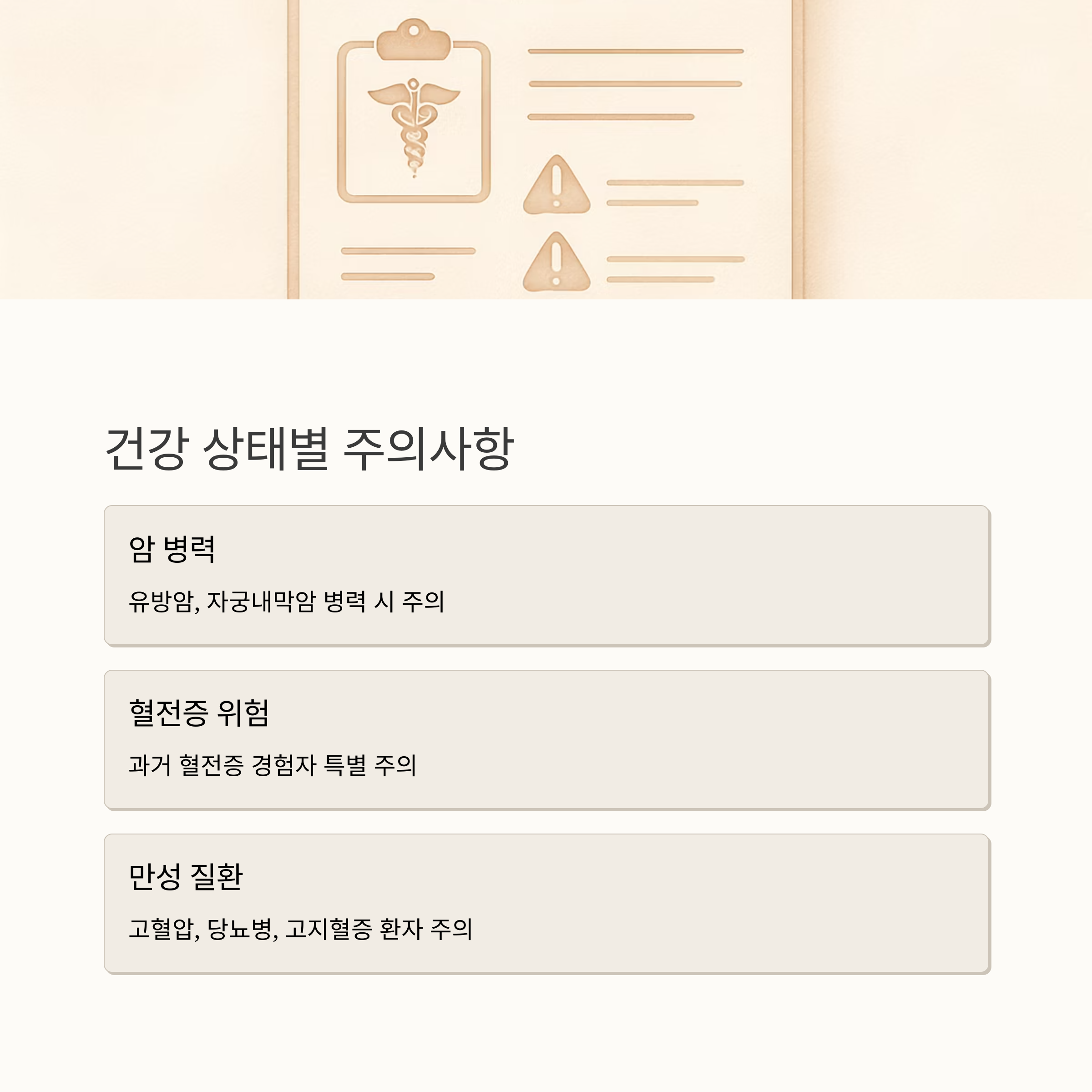 호르몬제 선택은 마치 맞춤옷을 고르는 것과 같아요. 자신의 건강 상태와 치료 목적에 맞춰 신중하게 결정해야 해요. 과거에 유방암이나 자궁내막암, 혈전증, 간 질환 등을 앓았다면, 혹은 고혈압, 당뇨병, 고지혈증 등 만성 질환이 있다면 더욱 주의해야 하고요.