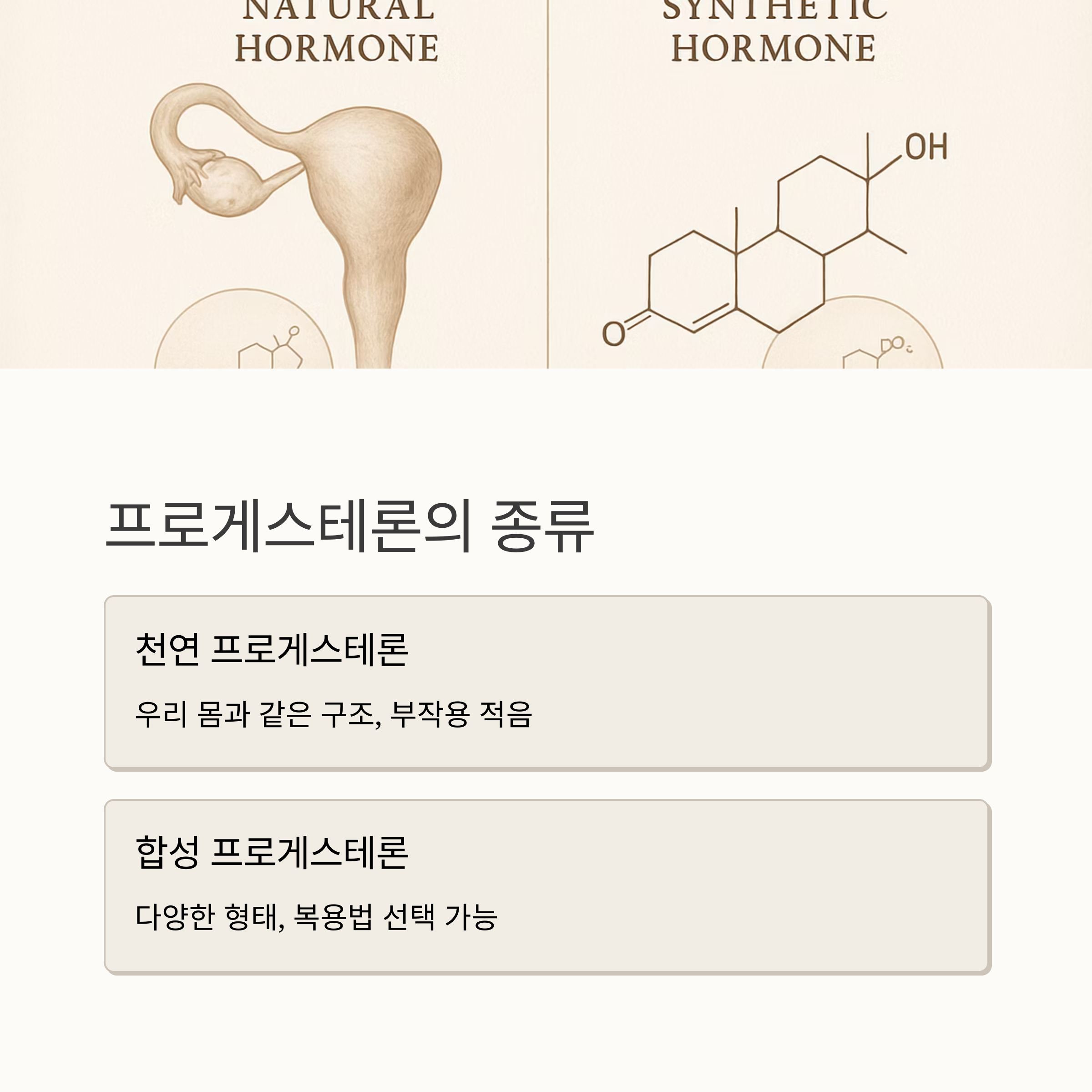 프로게스테론은 에스트로겐과 함께 여성 호르몬의 양대 산맥이라고 할 수 있어요. 자궁내막을 안정시켜주는 역할을 하기 때문에 에스트로겐과 함께 사용하면 자궁내막 질환 예방에 도움이 된답니다. 천연 프로게스테론은 우리 몸에서 만들어지는 것과 같은 구조라 부작용이 적고 안전하다는 장점이 있고요, 합성 프로게스테론은 여러 가지 형태로 나와서 복용법을 선택할 수 있다는 편리함이 있어요.