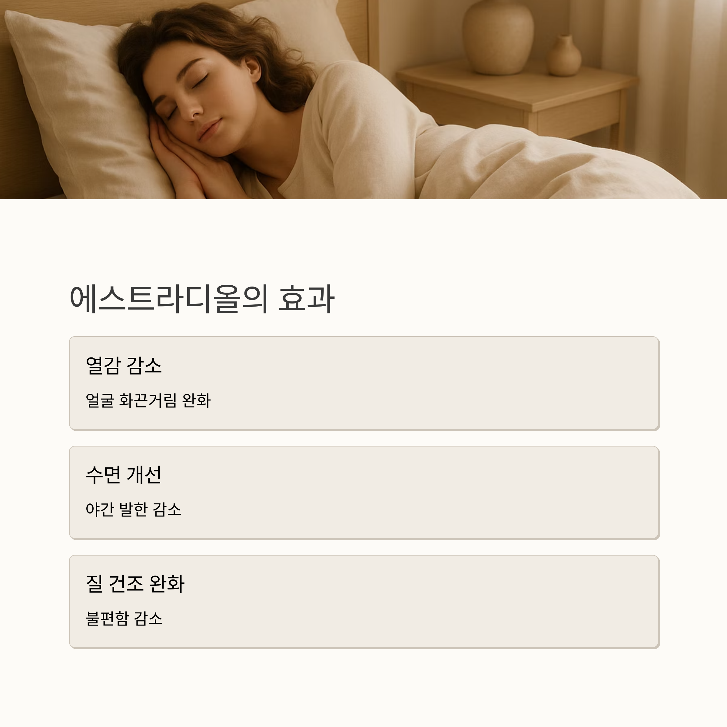 에스트로겐, 익숙한 이름이죠? 사실 에스트로겐은 하나의 호르몬이 아니라 여러 종류의 호르몬을 아우르는 말이에요. 에스트라디올, 에스트론, 에스트리올이 대표적인데, 각각의 활성도가 조금씩 다르답니다. 가장 활발한 에스트라디올은 폐경기의 뜨거운 얼굴, 밤잠 설치는 땀, 건조한 질 등 여러 증상을 완화하는데 효과적이에요.