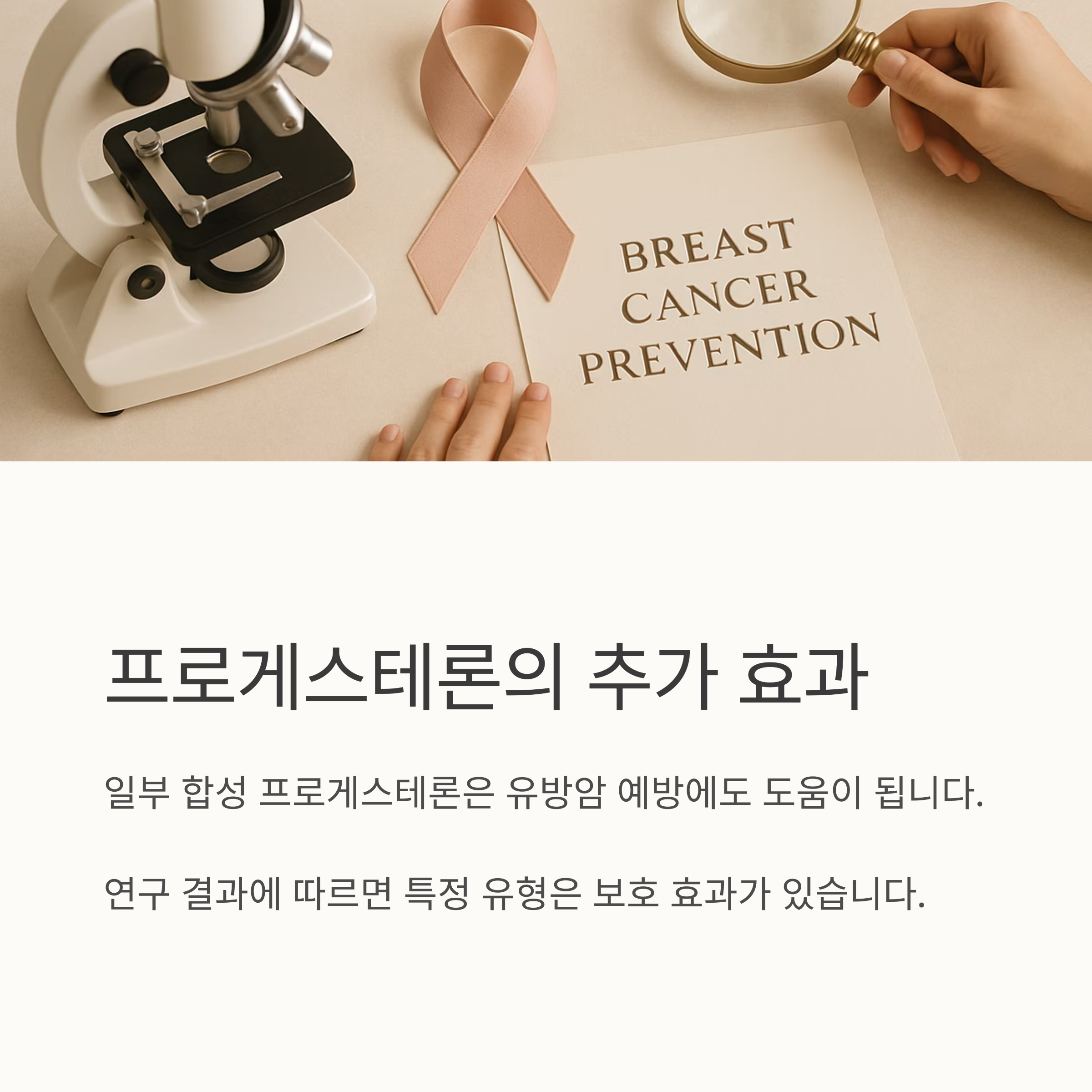 프로게스테론은 불규칙적인 생리를 정상화시키고, 임신을 유지하는 데에도 중요한 역할을 한답니다. 심지어 일부 합성 프로게스테론은 유방암 예방에도 도움이 된다는 연구 결과도 있어요. 하지만, 모든 약이 그렇듯 프로게스테론도 부작용이 있을 수 있어요. 유방 통증, 체중 증가, 부종, 우울증 등이 나타날 수 있고, 특히 일부 합성 프로게스테론은 혈전 위험을 높일 수 있다는 점을 유의해야 해요.