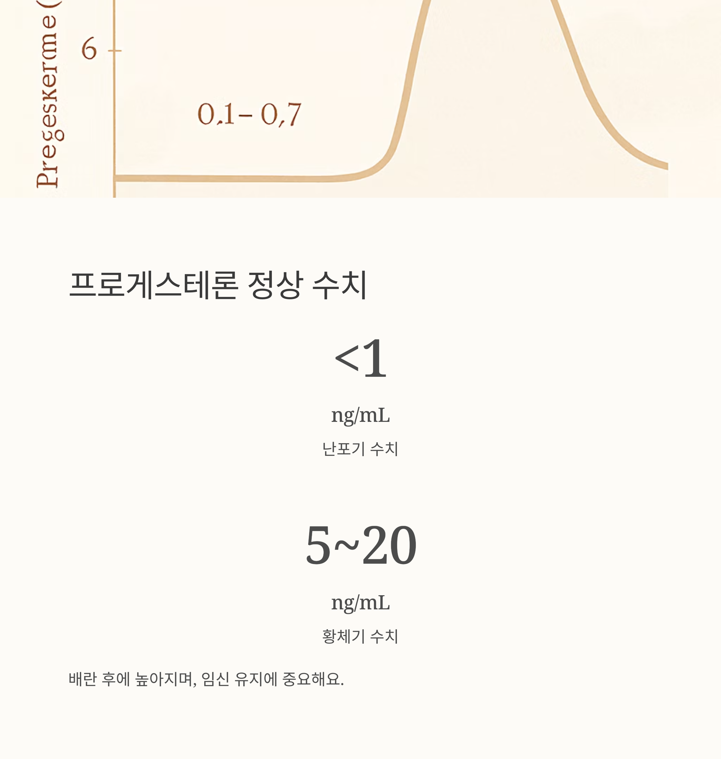 프로게스테론은 난포기에는 1 ng/mL 이하, 황체기에는 5~20 ng/mL 정도예요. 배란 후에 높아지죠. 프로게스테론 수치가 너무 낮거나 높으면 문제가 생길 수 있으니 조심해야 해요.