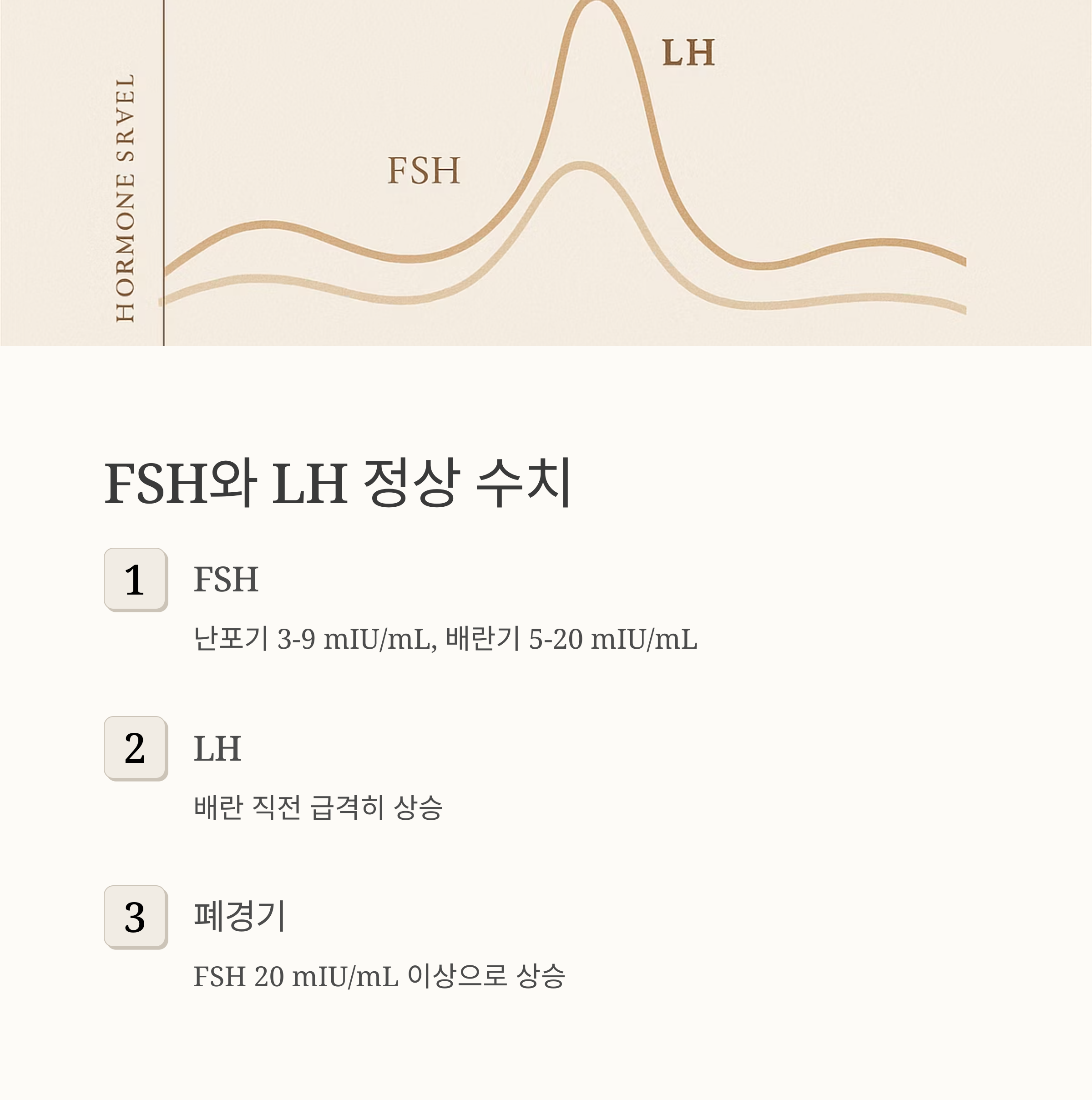 FSH는 난포기에는 3-9 mIU/mL, 배란기에는 5-20 mIU/mL 정도이고요, 폐경기 여성은 20 mIU/mL 이상으로 높아져요. FSH 수치가 높으면 난소 기능이 떨어지는 걸 의미할 수 있어요.