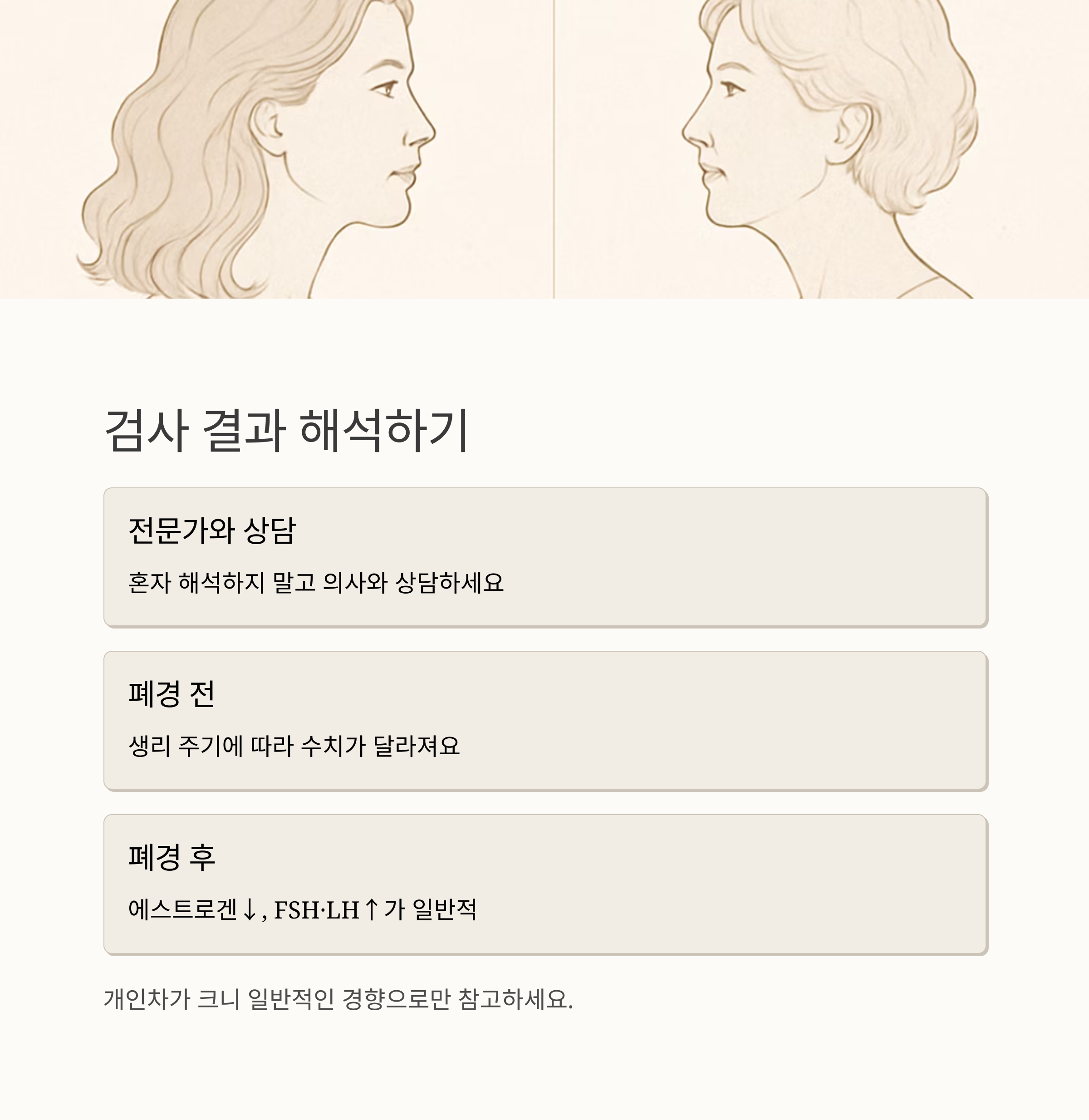 결과 해석은 폐경 전과 폐경 후로 나눠서 생각해 볼 수 있어요. 폐경 전 여성은 생리 주기에 따라 수치가 달라지고, 폐경 후 여성은 에스트로겐 수치가 낮아지고 FSH, LH 수치가 높아지는 게 일반적이에요. 하지만 이건 일반적인 경향일 뿐, 개인차가 크다는 점 기억해 주세요.