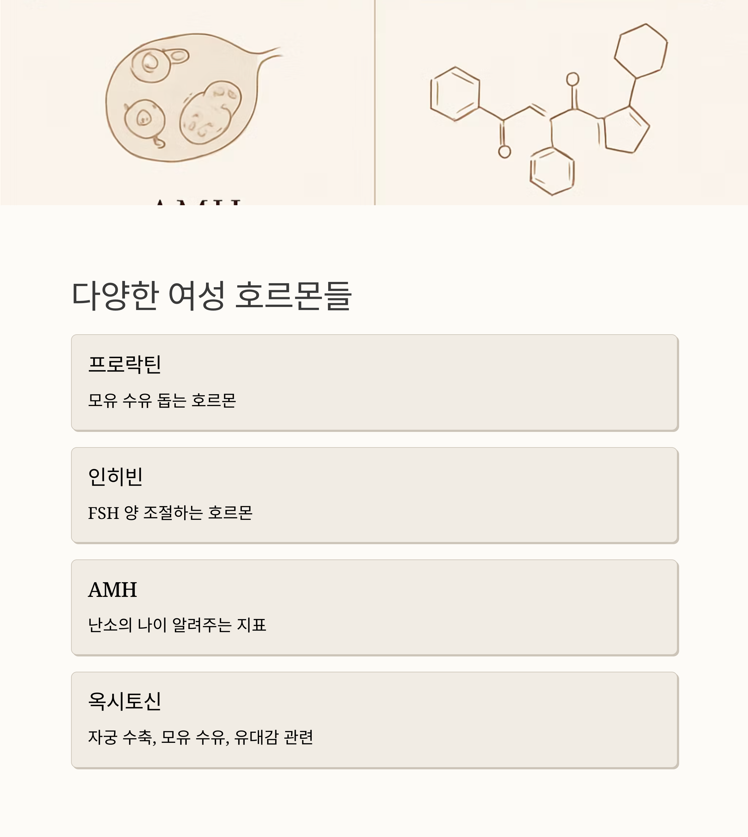 프로락틴은 모유 수유를 돕는 호르몬이에요. 임신이나 수유 중에 많아지지만, 임신하지 않았는데 프로락틴 수치가 높으면 생리 불순이 생길 수도 있어요. 인히빈은 FSH의 양을 조절하고, AMH는 난소의 나이를 알려주는 지표가 된답니다. 마지막으로 옥시토신은 자궁 수축을 돕고 모유 수유를 촉진하며, 사랑이나 유대감 같은 감정과도 관련이 있다고 하네요. 정말 신비롭죠?