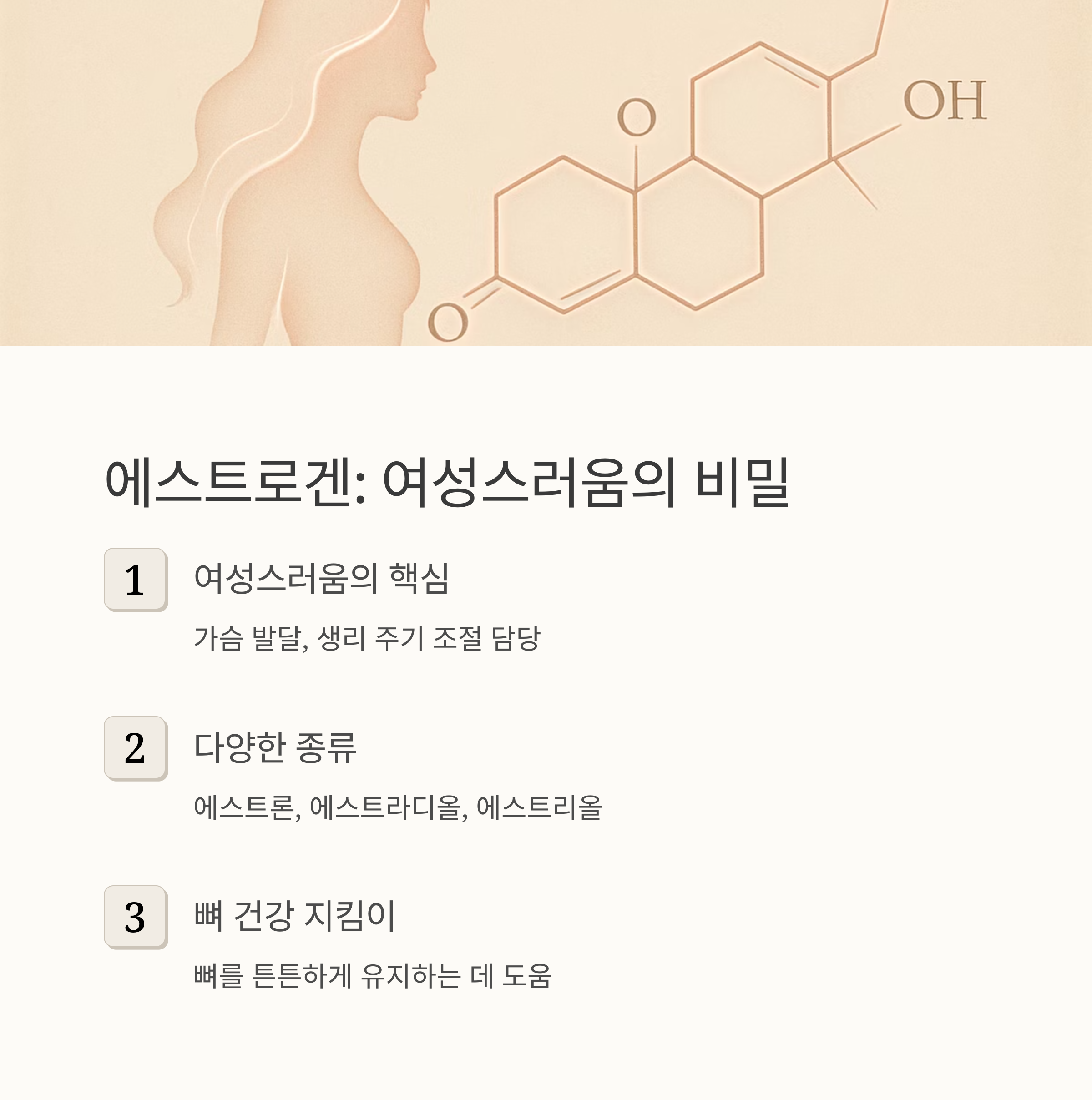 에스트로겐은 여성스러움을 만드는 호르몬이라고 생각하면 돼요. 가슴 발달이나 생리 주기 조절 같은 역할을 하죠. 종류도 에스트론, 에스트라디올, 에스트리올 등 다양해요. 에스트라디올은 가임기 여성에게 가장 중요하고, 에스트론은 폐경 후에도 조금 남아 있어요. 에스트리올은 임신 중에 많아지는 호르몬이랍니다. 에스트로겐은 뼈 건강에도 중요한 역할을 해요. 뼈를 튼튼하게 유지하는 데 도움을 주니까 뼈 건강에 신경 쓰는 분들은 에스트로겐에 더욱 관심을 가져야 해요.