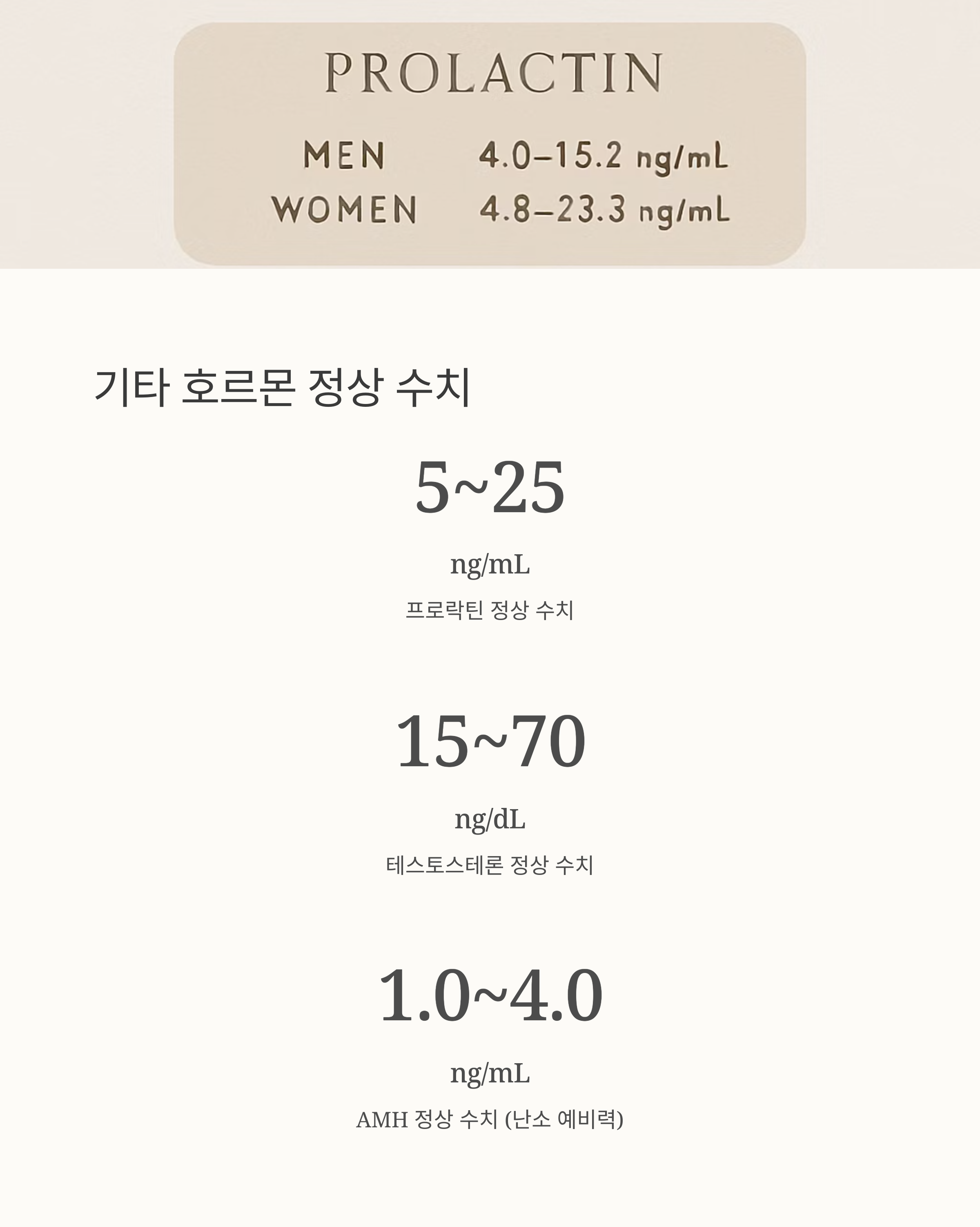 프로락틴은 5-25 ng/mL가 정상 범위이고요, 테스토스테론은 15-70 ng/dL 정도예요. AMH는 1.0~4.0 ng/mL 정도인데 이 수치는 난소의 남은 난자 수를 보여주는 지표랍니다. AMH 수치가 낮으면 임신이 어려울 수도 있어요.