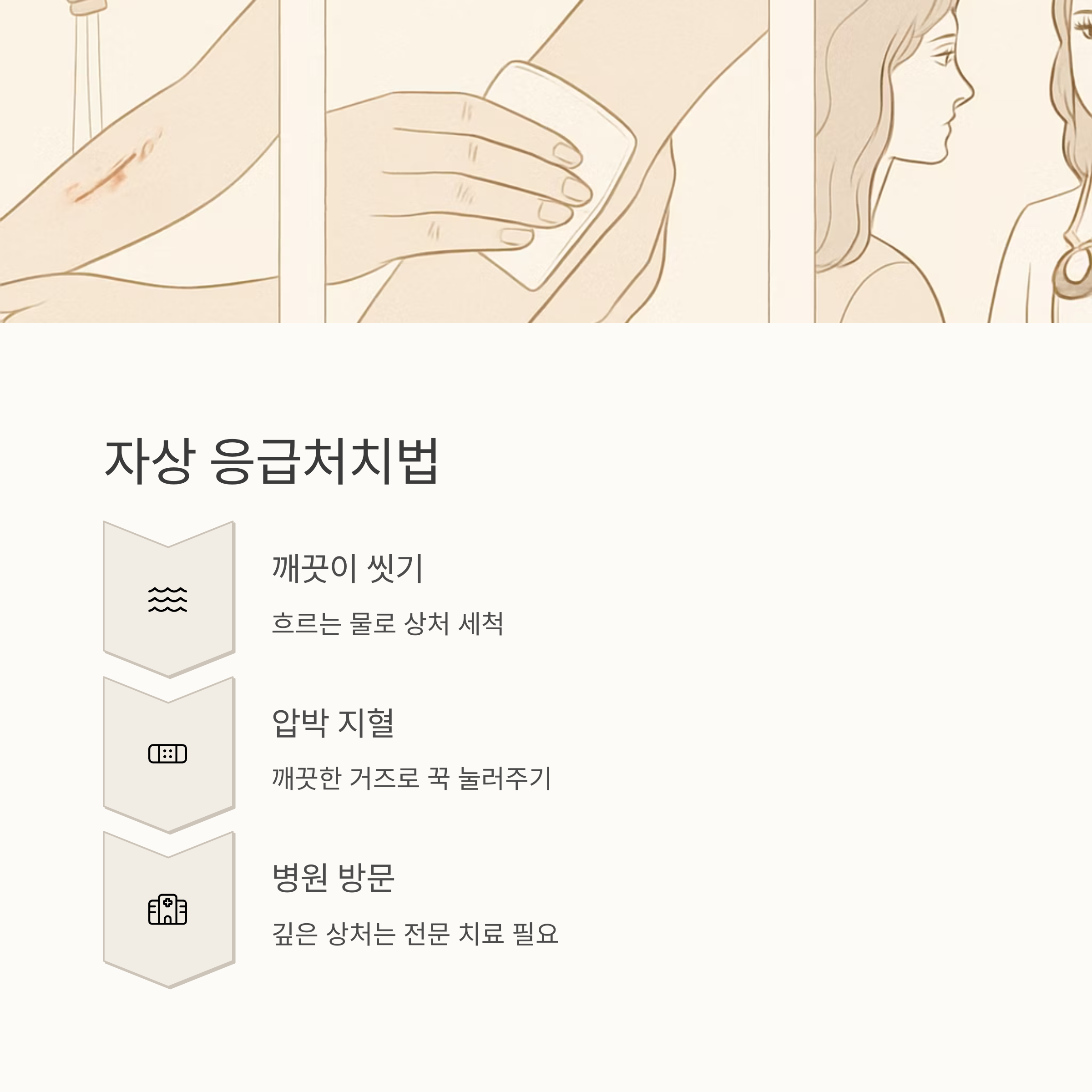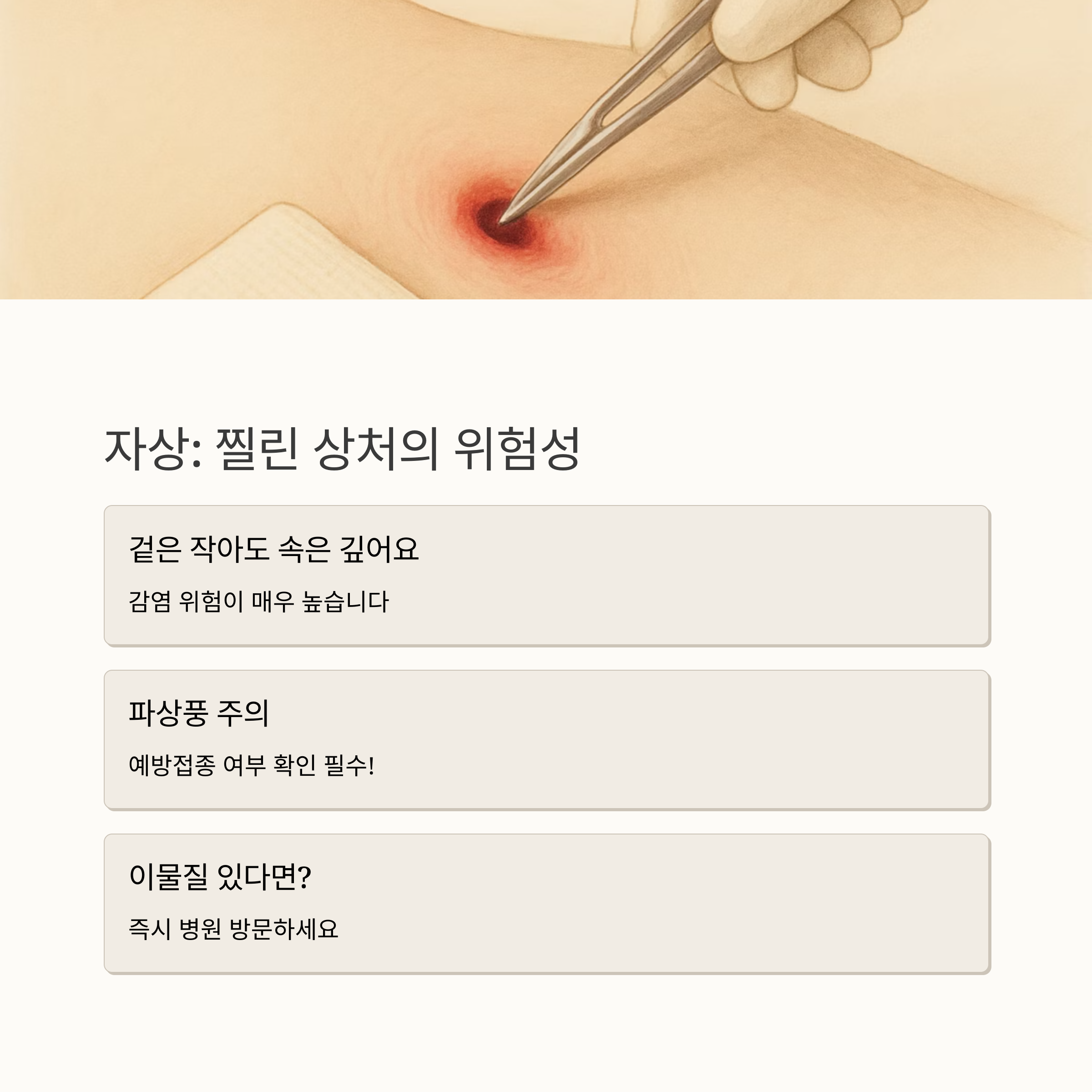 각 상처 유형에 대해 살펴봤는데요, 상처의 종류를 제대로 구분하고, 적절한 응급처치를 하는 것이 빠른 회복과 감염 예방에 매우 중요합니다. 하지만 붓거나 열이 나거나, 이물질이 남아 있거나, 상처가 벌어졌다면 집에서의 간단한 처치보다는 병원을 찾는 것이 훨씬 안전합니다. 상처는 절대 방심해서는 안 됩니다. 항상 안전을 최우선으로 생각하세요.
