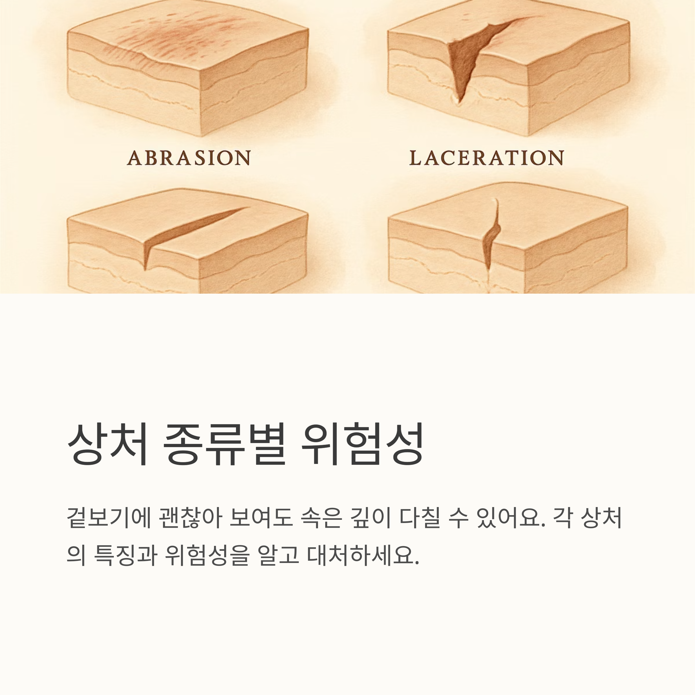 겉보기에는 괜찮아 보여도 속은 깊이 다칠 수 있으니, 절대 방심하면 안 돼요! 특히 깊은 상처나 출혈이 많다면 바로 병원에 가는 게 제일 안전하다는 걸 잊지 마세요. 우리가 흔히 겪는 네 가지 상처 유형에 대해 자세히 알아볼게요.