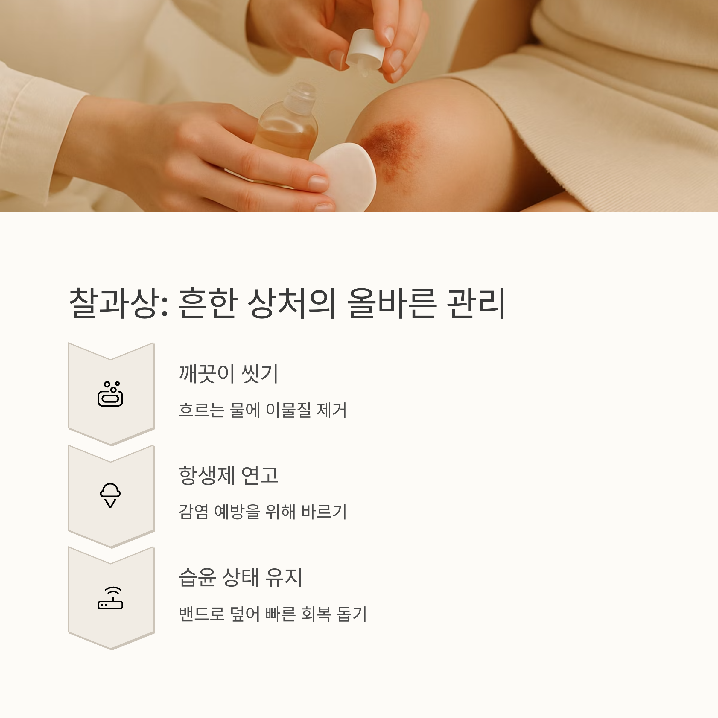 흔히 무릎이 까지거나 하는 찰과상은 피부 표면이 벗겨진 상처예요. 출혈은 적지만, 먼지나 흙이 잘 묻으니 흐르는 물에 깨끗하게 씻어야 해요. 항생제 연고를 바르고 밴드를 붙여 습윤 상태를 유지하면 흉터 없이 빨리 나아요.