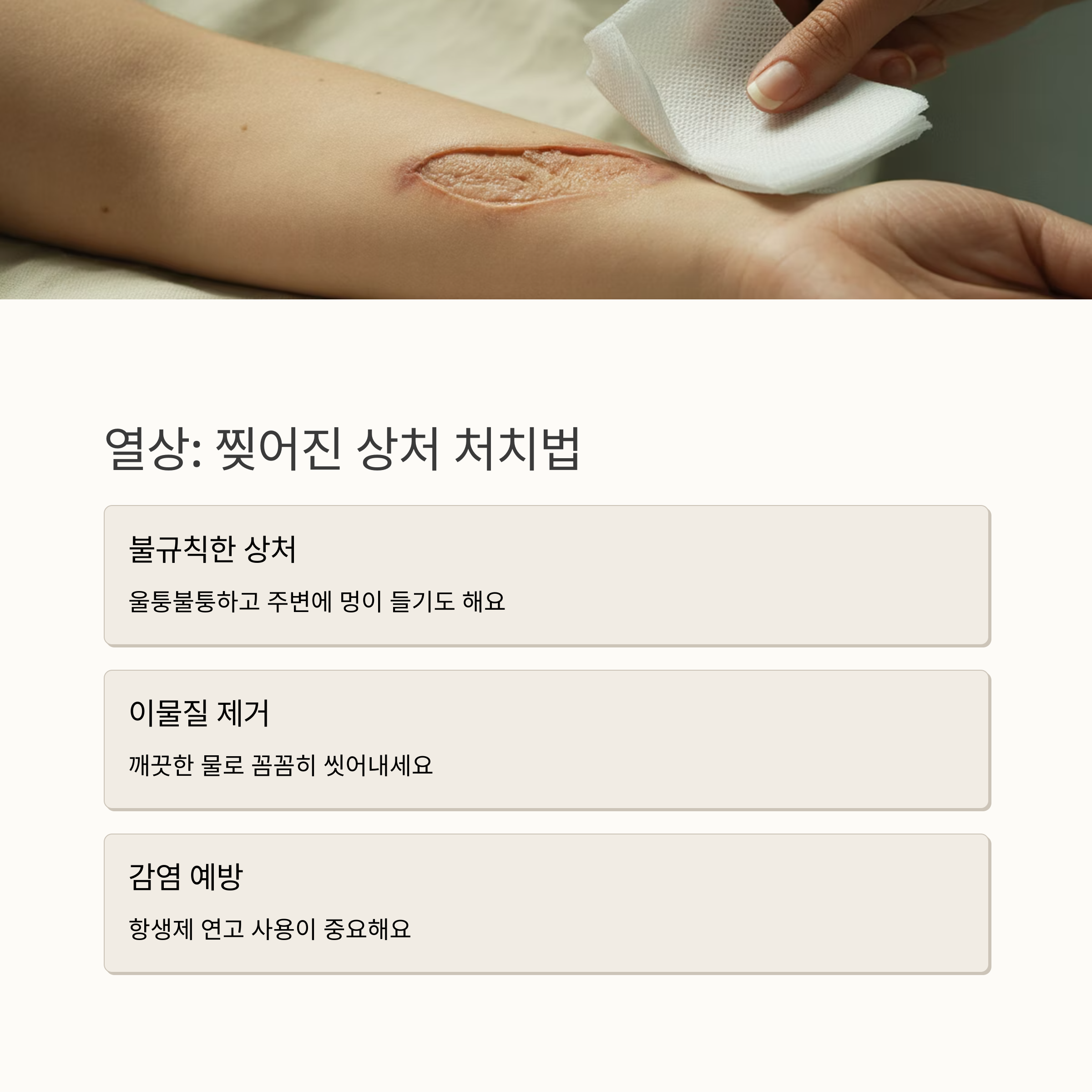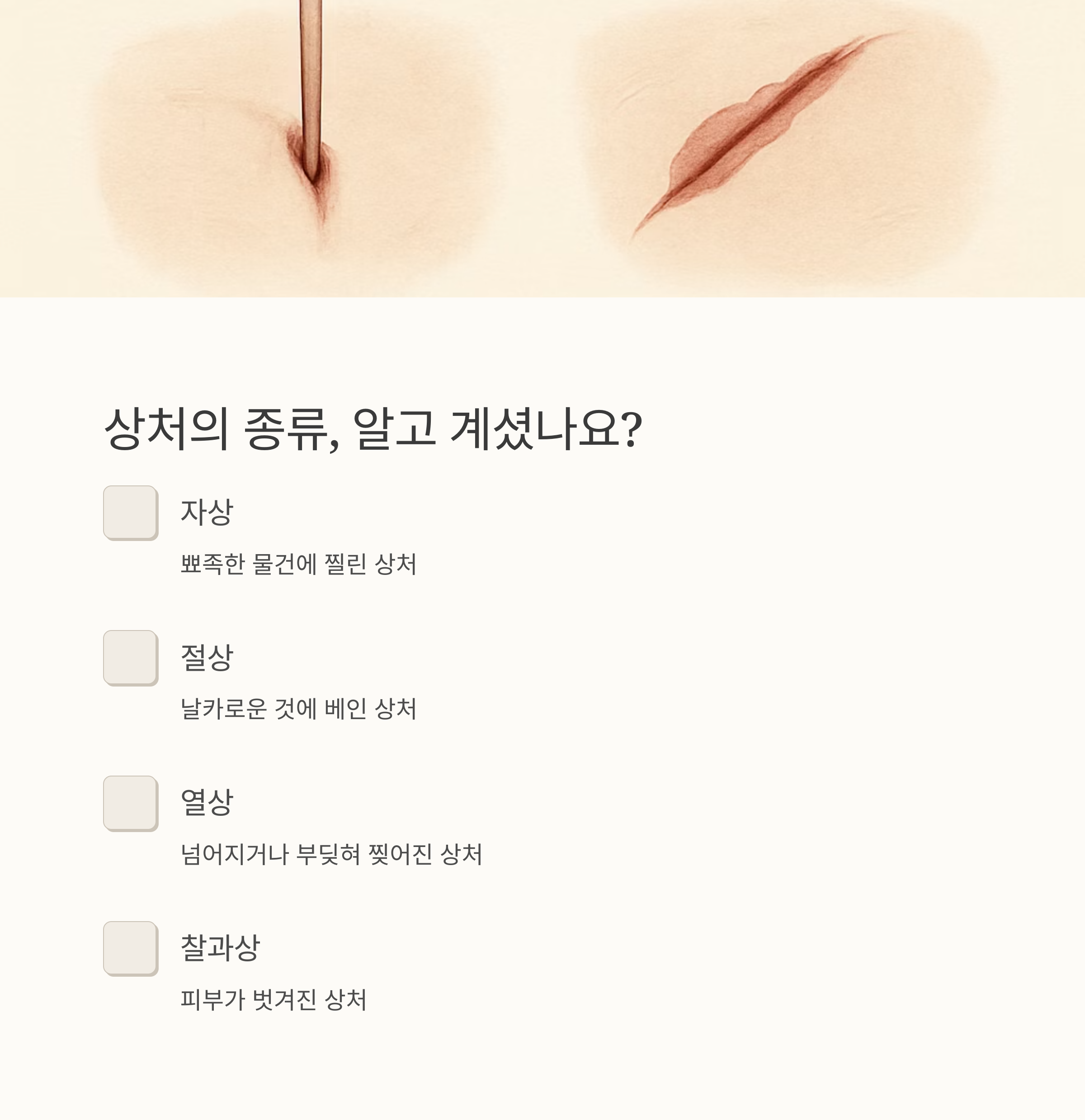 안녕하세요! 생활 속에서 크고 작은 상처는 누구나 경험할 수 있는 일이죠. 이 글에서는 다양한 상처 유형과 안전하게 대처하는 방법을 알려드려 더 이상 상처 때문에 걱정하지 않도록 도와드리겠습니다. 함께 알아볼까요?