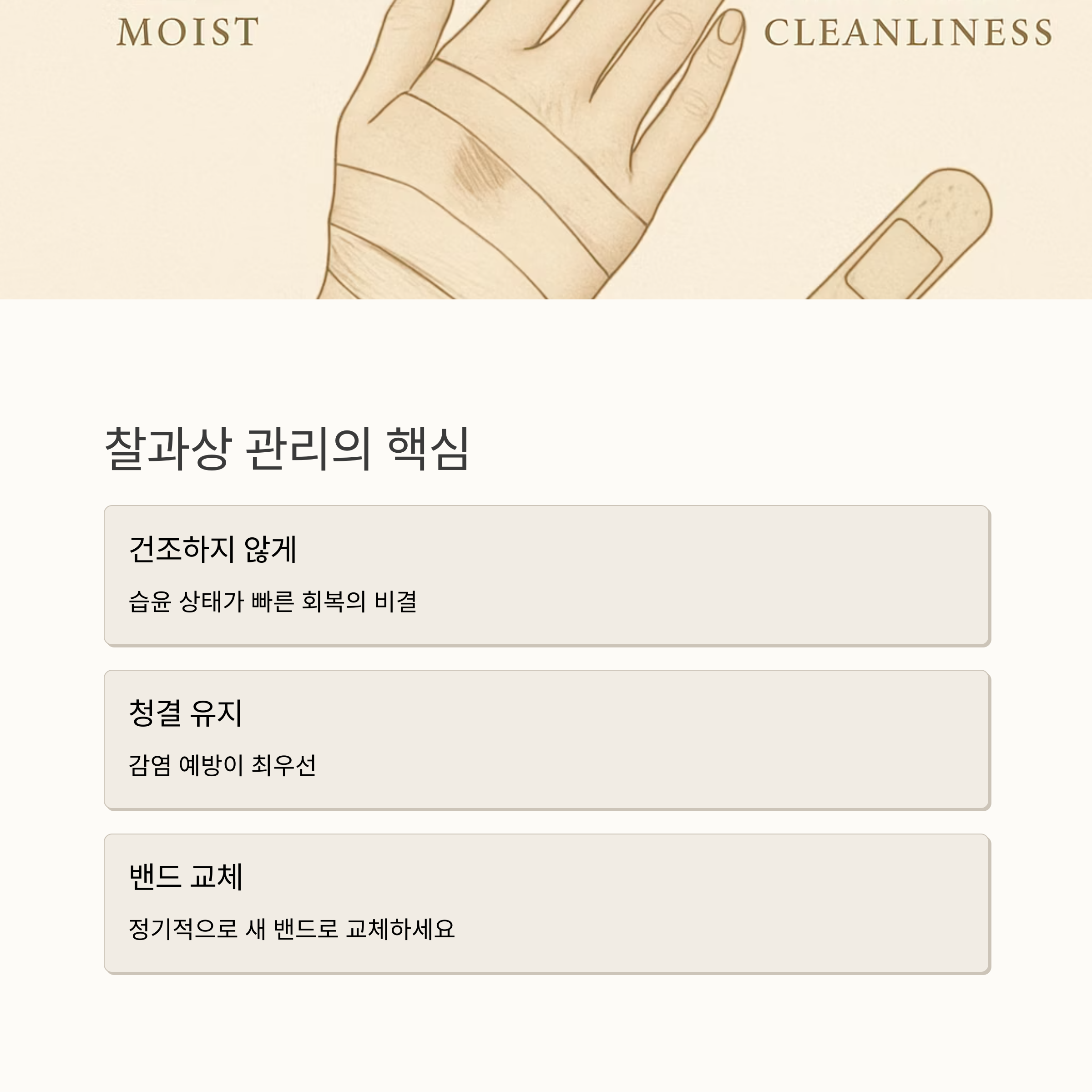 상처가 마르지 않게 관리하는 것이 중요하답니다. 찰과상은 흔히 경험하는 상처 유형이지만, 관리를 잘못하면 감염될 위험이 있으니 주의해야 합니다. 항상 깨끗하게 관리하고, 감염 증상이 보이면 바로 병원에 가는 것을 잊지 마세요. 또한, 습윤 상태를 유지하여 상처 회복을 촉진하는 것이 좋습니다.