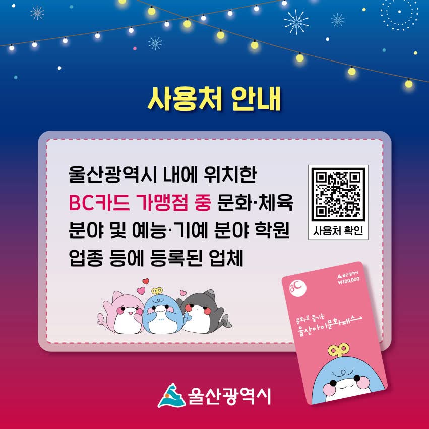 울산시립미술관, 울산박물관, 장생포고래박물관 같은 전시장도 이용 가능하답니다. 아이들의 예체능 교육에도 도움이 되도록 미술학원, 음악학원, 체육센터 등도 사용처로 등록되어 있어요. 키즈카페나 창의융합체험센터, 도서관 체험 프로그램 같은 곳에서도 사용 가능하니, 아이들이 좋아하는 다양한 활동을 지원할 수 있겠죠?
