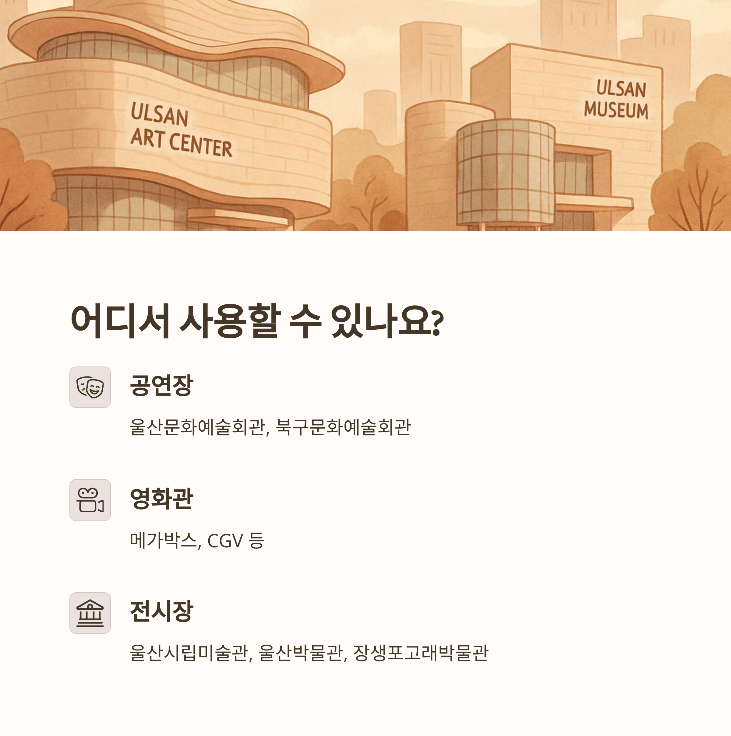 울산아이문화패스는 어디서 사용할 수 있을까요? 사용 가능한 곳이 정말 많아서 놀라실 거예요. 울산문화예술회관, 북구문화예술회관 같은 공연장부터 메가박스, CGV 등 영화관도 포함되어 있어요.