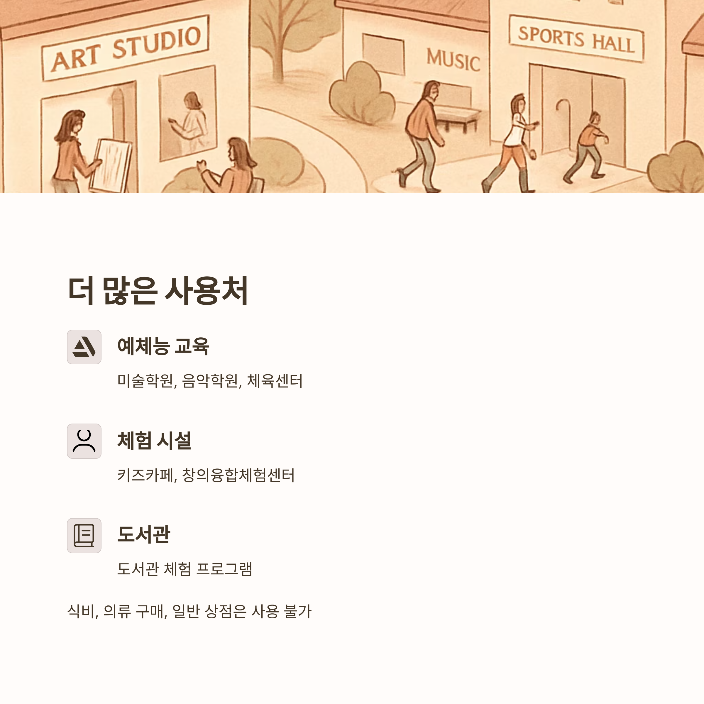 하지만 식비나 의류 구매, 일반 상점 이용은 안된다는 점, 꼭 기억해주세요! 홈페이지에 접속하시면 주변 사용처를 쉽게 찾아볼 수 있으니, 아이와 함께 가고 싶은 곳을 미리 확인해보는 것도 좋을 것 같아요. 정말 다양한 곳에서 사용할 수 있으니, 활용도가 높겠죠?