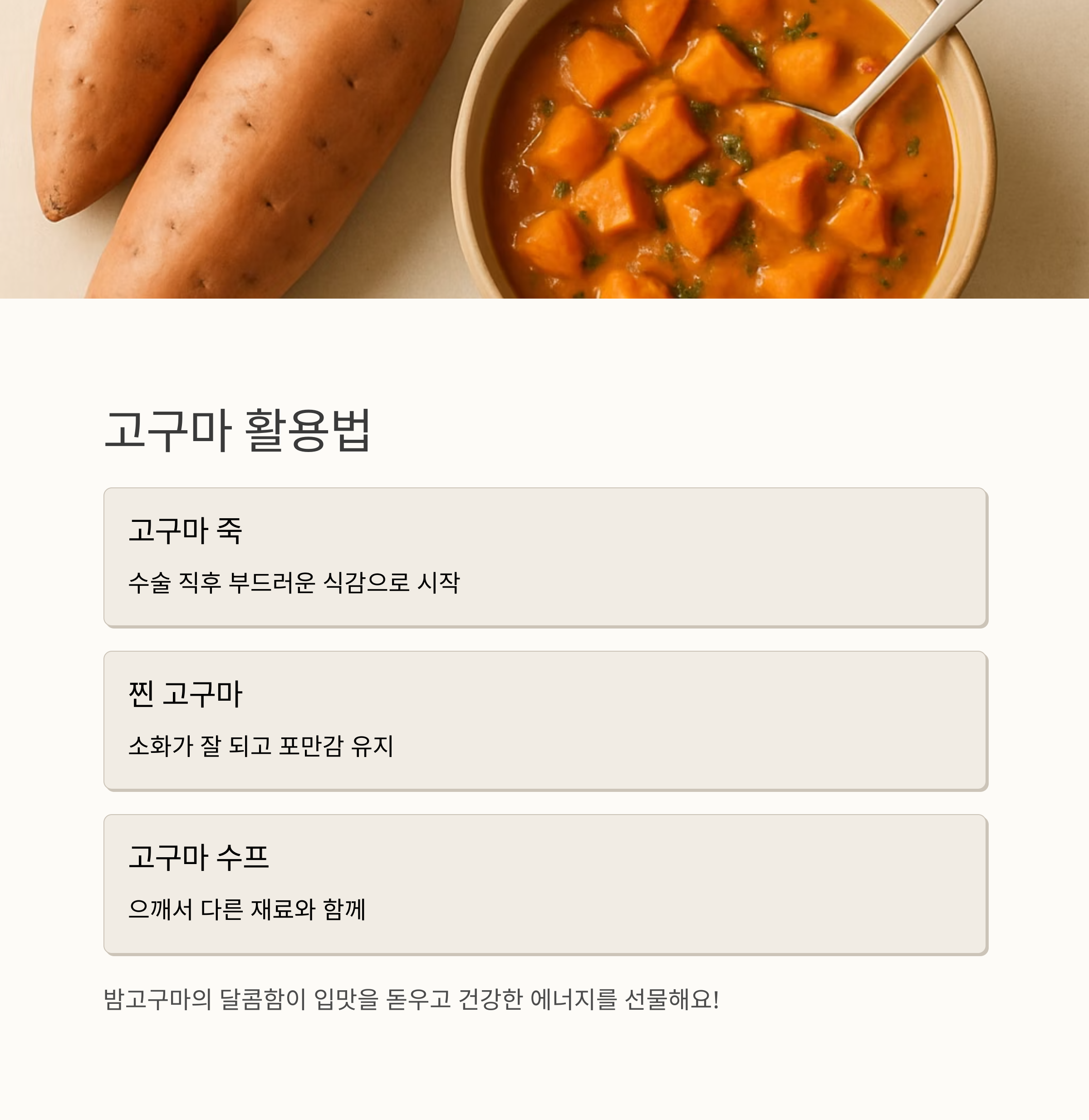 고구마는 아버지 수술 후 회복기에 큰 도움이 된 식품이에요. 수술 직후에는 소화가 잘 되지 않아 식사가 큰 고민이었는데, 고구마는 부드러운 식감과 달콤한 맛 덕분에 아버지가 잘 드셨어요. 고구마 죽으로 시작해서, 점차 찐 고구마나 구운 고구마로 조금씩 식단을 늘렸죠. 고구마에는 베타카로틴, 식이섬유, 비타민C가 풍부해요.