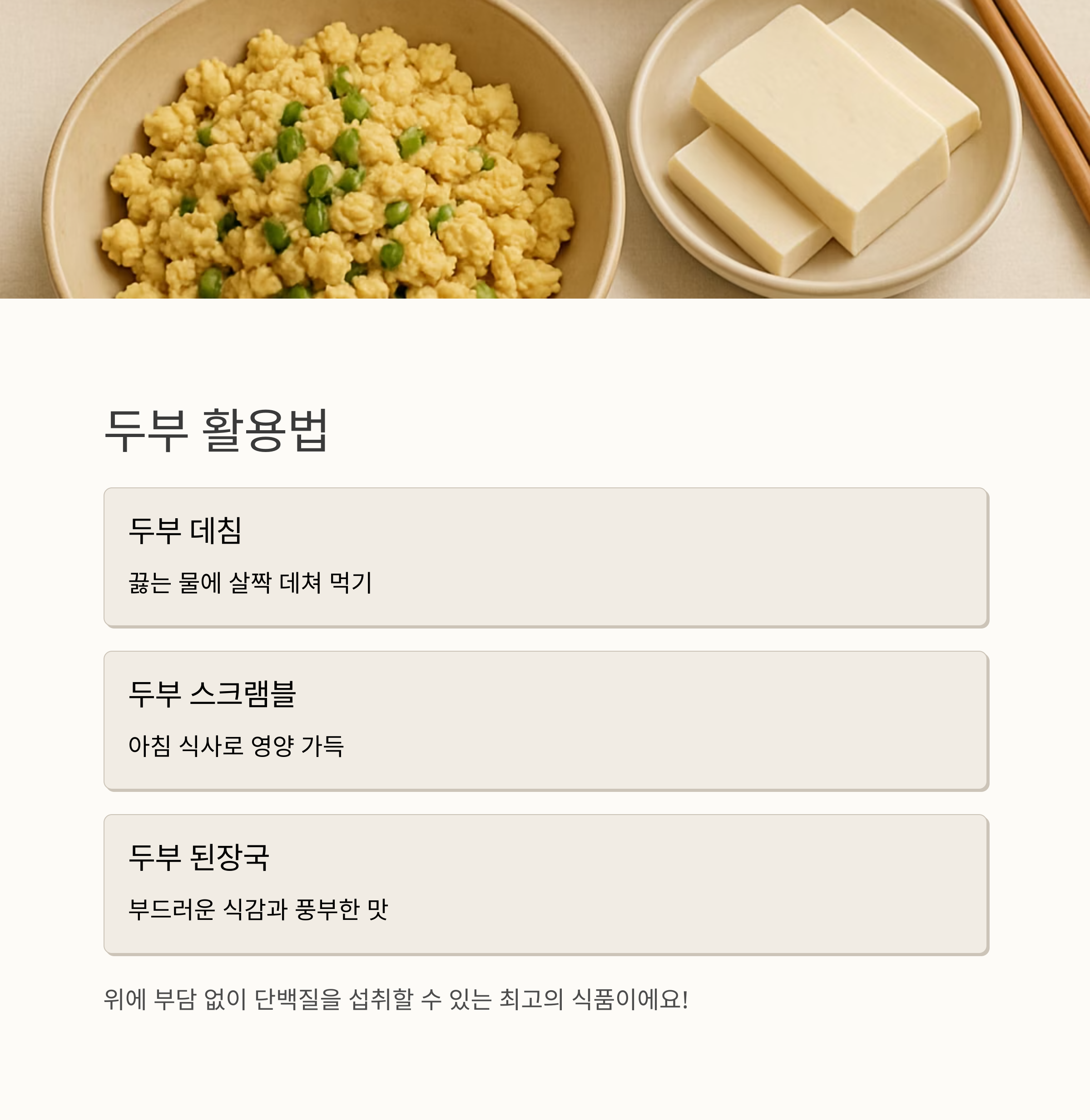 두부 스크램블을 만들어 아침 식사로 먹거나, 두부를 으깨서 샐러드에 넣어 먹어도 좋고, 두부를 이용해서 다양한 찌개나 볶음 요리도 만들어 먹을 수 있어요. 두부는 저희 가족에게 위에 부담 없이 단백질을 섭취할 수 있는 좋은 방법이었어요. 부드럽고 영양 가득한 두부 요리로 건강을 챙겨보세요.