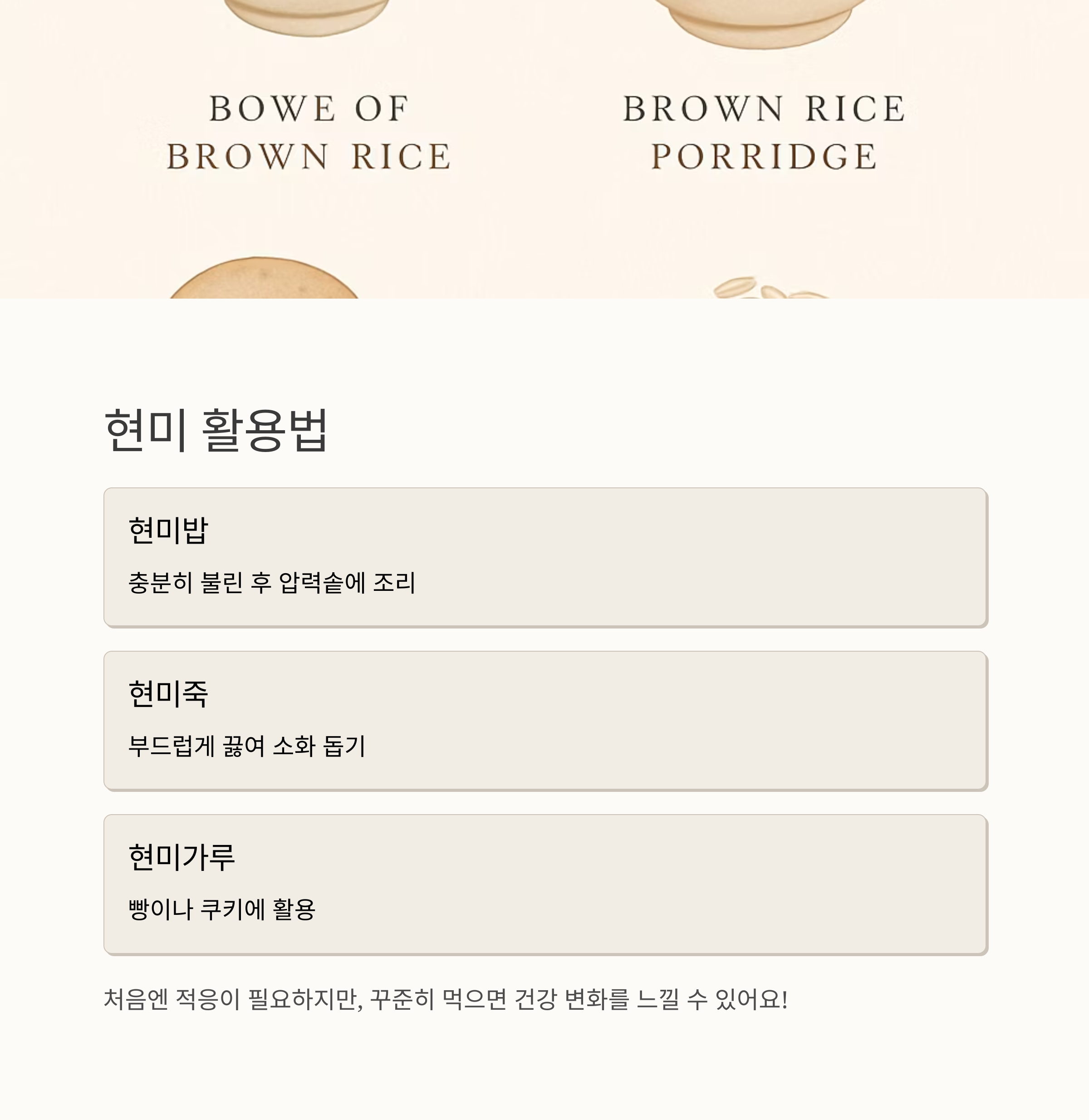 무엇보다 중요한 것은 현미를 잘 익혀서 부드럽게 만들어 먹는 거예요. 현미밥을 먹으면서 저희 가족 모두 건강해지는 느낌이에요. 현미의 영양 가득한 맛과 부드러운 식감에 반하실 거예요!