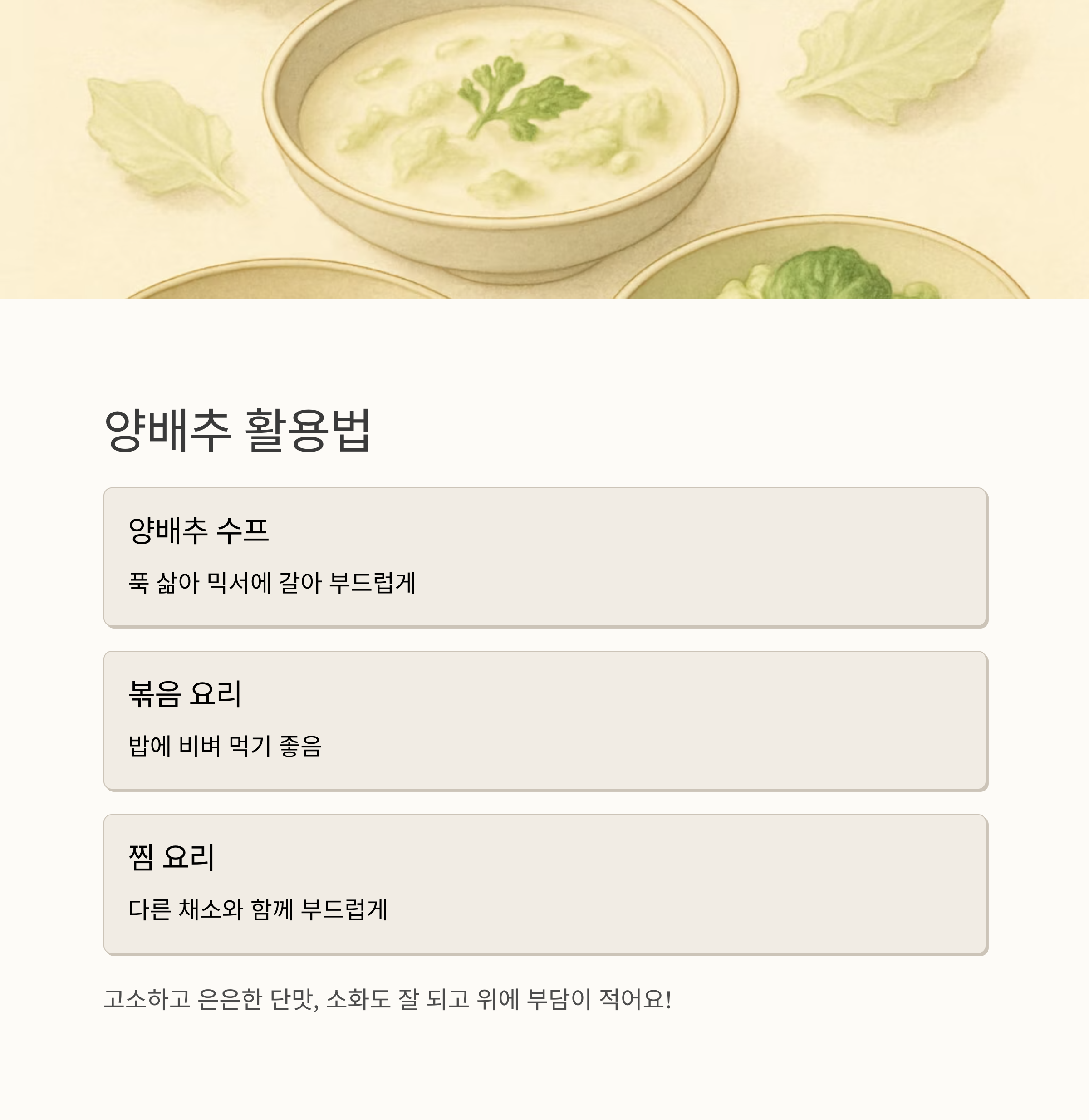 처음엔 맛이 심심할까 걱정했는데, 생각보다 고소하고 은은한 단맛도 느껴졌어요. 양배추에는 위점막을 보호하는 비타민 U와 항산화 성분인 설포라판이 풍부하다고 해요. 생양배추는 위에 자극이 될 수 있으니, 꼭 익혀서 먹는 게 중요해요. 저희는 삶은 양배추를 냉동실에 얼려두고 필요할 때마다 꺼내 쓰니까 정말 편했어요. 양배추를 넣은 수프 외에도, 양배추를 볶아서 밥에 비벼 먹거나, 다른 채소와 함께 찜으로 만들어 먹기도 했어요.
