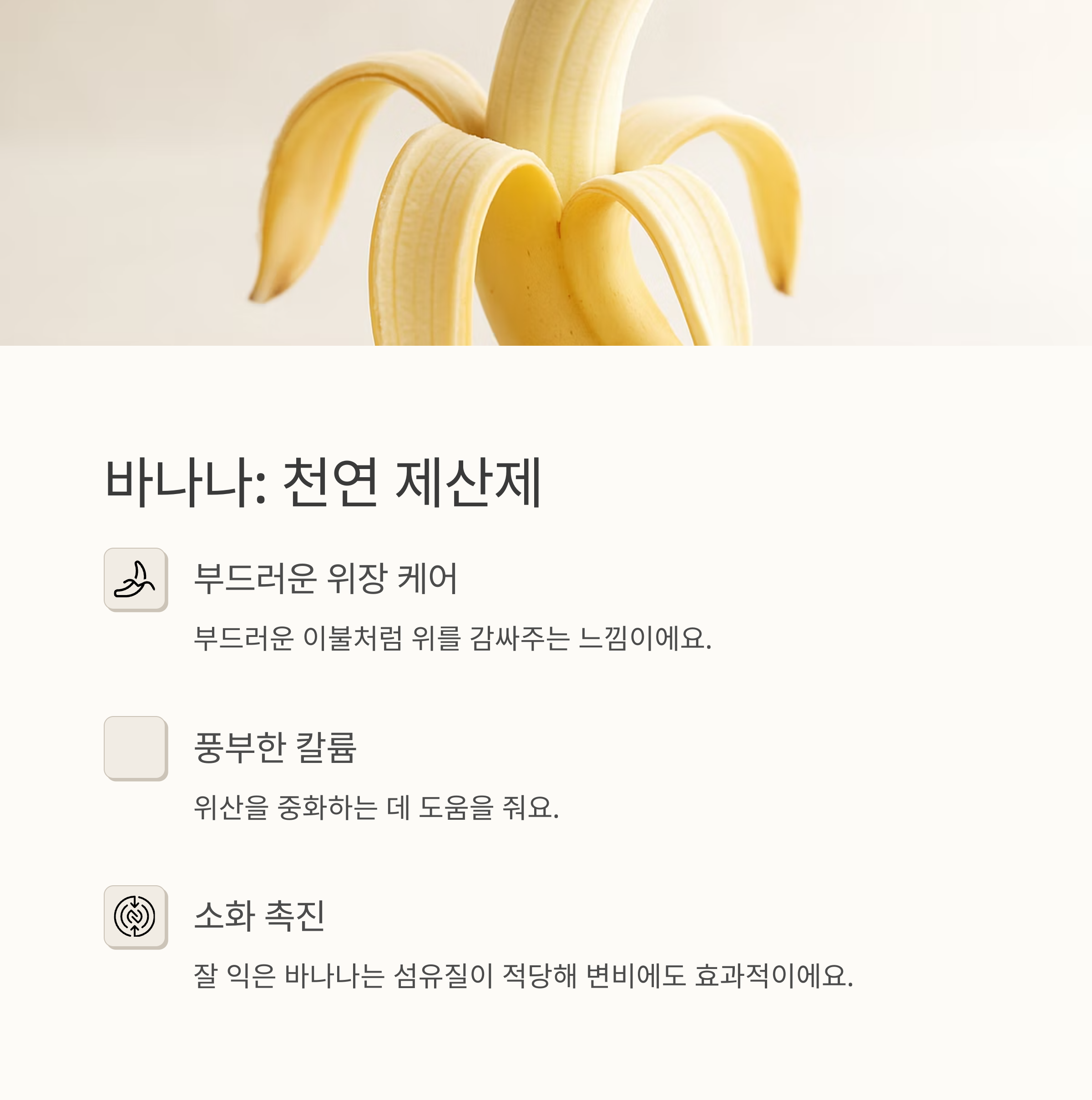 위에 좋은 과일 바나나는 부드럽고 소화가 잘 되는 과일이에요. 마치 부드러운 이불처럼 위를 감싸주는 느낌이랄까요? 특히 칼륨이 풍부해서 위산을 중화하는 데에도 도움을 준답니다. 속쓰림이 있을 때 바나나 하나 먹으면 정말 신세계를 경험하실 거예요! 저는 갑자기 속이 쓰릴 때 바나나를 으깨서 먹곤 하는데, 부드러운 식감이 위를 진정시켜 주는 느낌이 들어요.