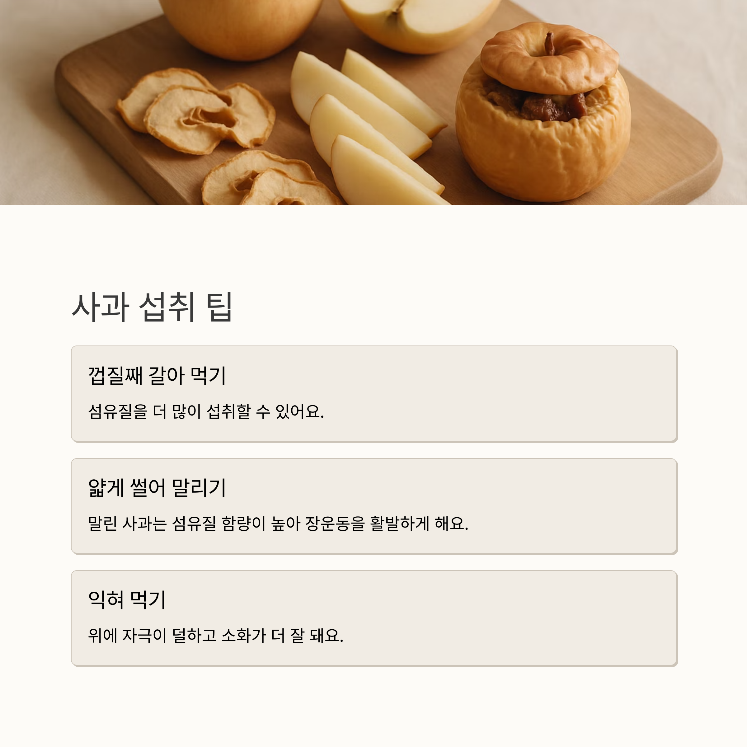 특히 익힌 사과는 생과일보다 소화가 더 잘 되고 위에 자극도 덜하니 참고하세요. 사과의 달콤한 향긋함이 위장을 편안하게 감싸는 상상을 해보세요. 만약 소화가 잘 안 된다면 사과를 익혀서 먹는 방법을 추천드립니다. 익힌 사과는 생과일보다 위에 부드럽게 작용해요. 사과의 새콤달콤한 맛과 향긋한 향은 스트레스받은 위장을 진정시켜주는 효과도 있답니다. 소화가 잘 안될때는 사과를 얇게 썰어서 말려서 먹어보세요. 말린 사과는 섬유질 함량이 높아져서 장운동을 더욱 활발하게 도와준답니다.