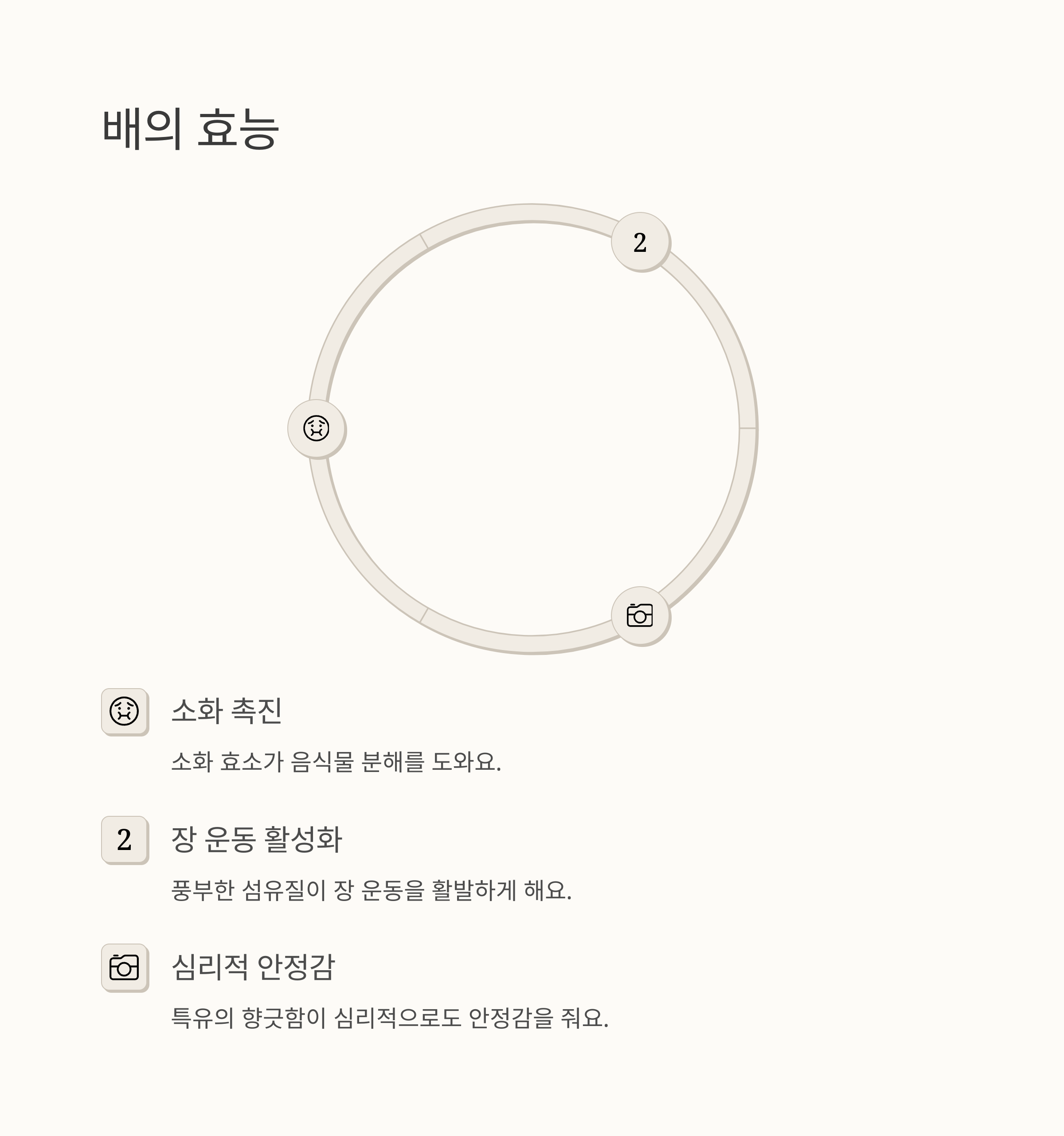 고기 먹고 속이 더부룩할 때, 배 한 조각 먹어보세요. 저는 삼겹살 먹은 다음날 배를 먹으면 소화가 잘 되는 것을 느껴요. 달콤하고 시원한 맛은 입안을 상쾌하게 해주고, 섬유질도 풍부해서 장 운동을 활발하게 해준답니다. 배의 부드러운 식감은 위에 자극을 주지 않고 부드럽게 넘어가요. 배의 특유의 향긋함은 심리적으로도 안정감을 주는 효과가 있어요.