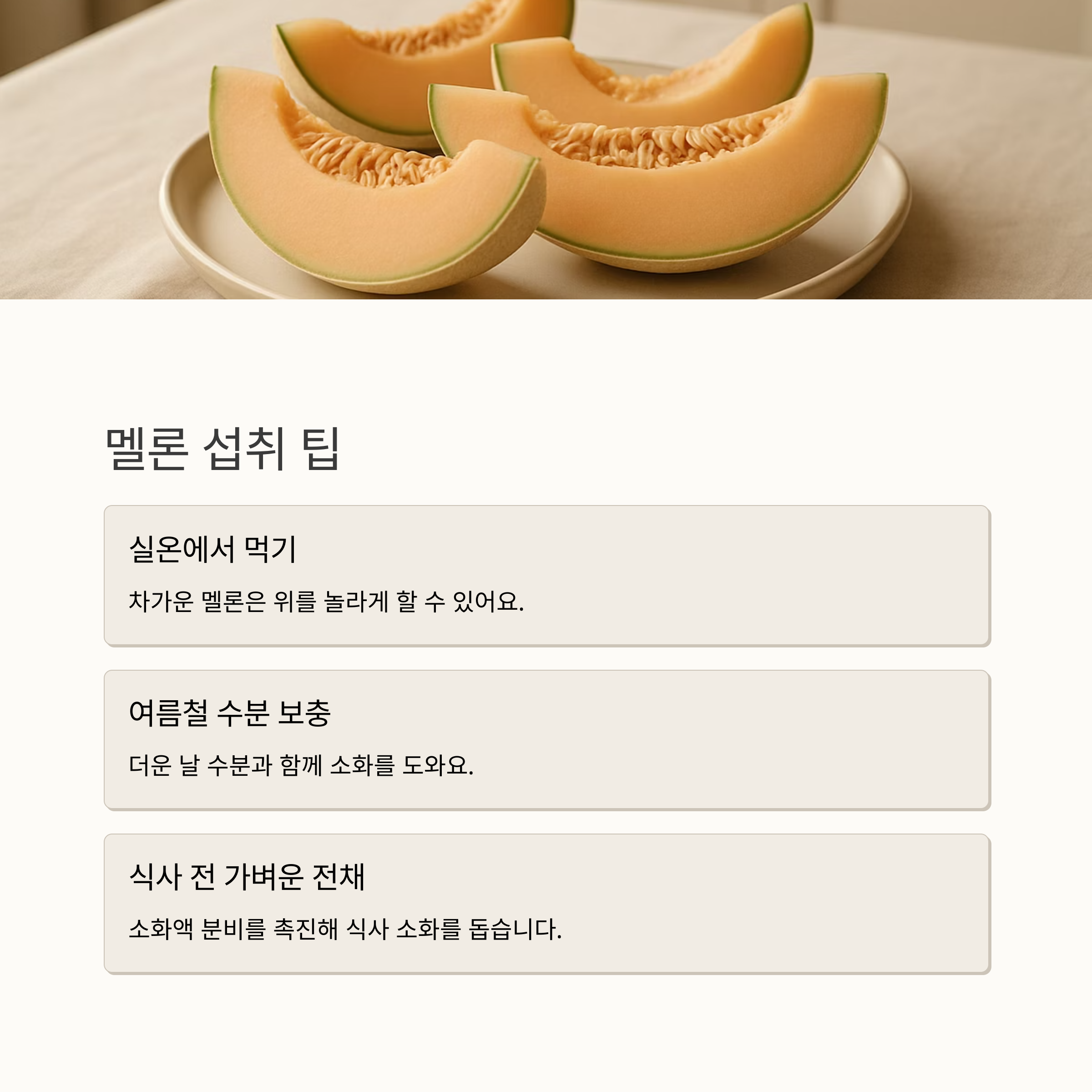하지만 차가운 멜론을 바로 먹으면 위가 놀랄 수 있으니, 실온에 두었다가 먹는 게 좋아요. 멜론의 싱그러운 향과 달콤한 맛은 입안에 퍼지는 청량감으로 기분을 좋게 만들어 줍니다. 멜론의 수분은 소화액 분비를 원활하게 돕고, 부드러운 과육은 위장에 자극 없이 부드럽게 스며들어요.