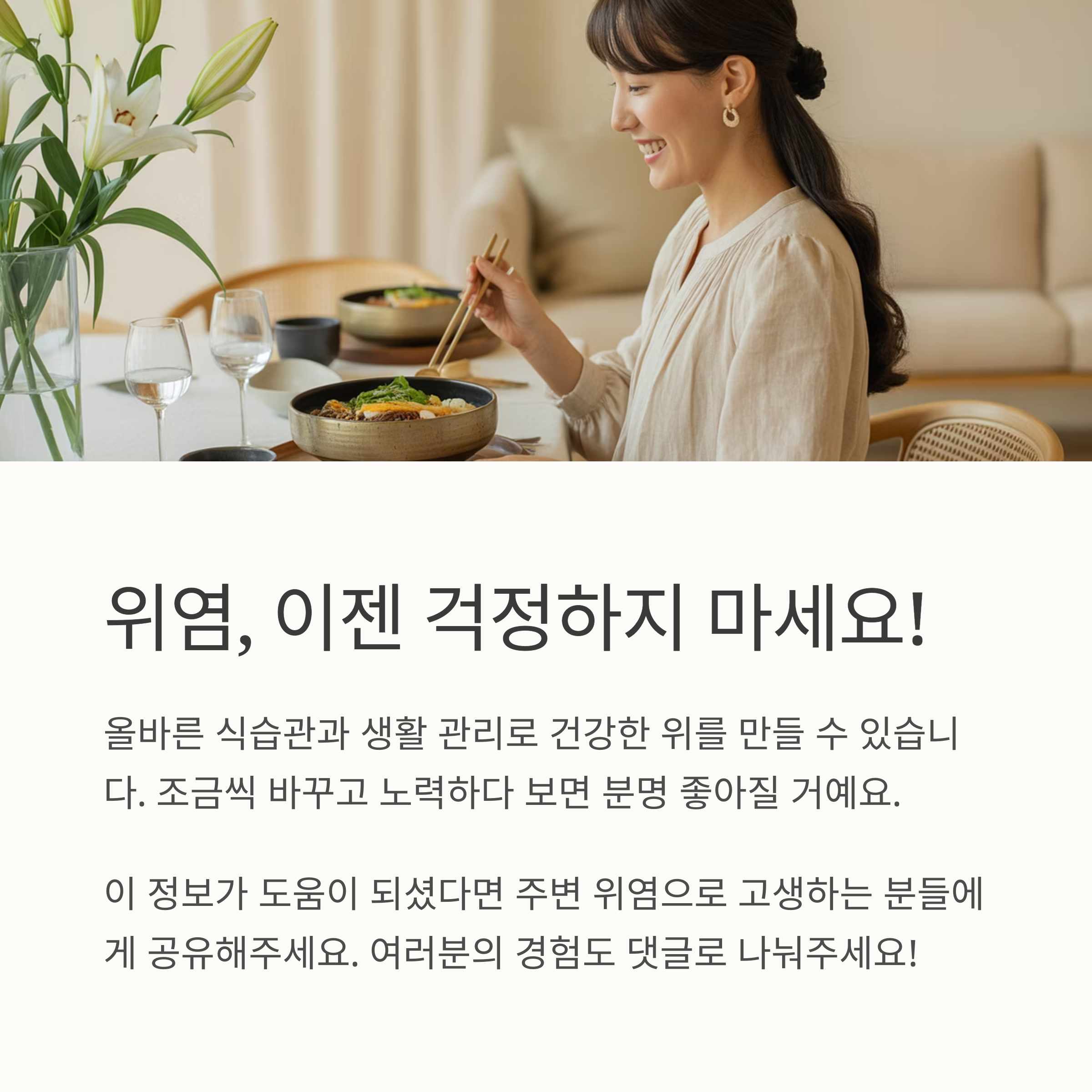 위염, 이젠 걱정하지 마세요! 제가 알려드린 정보와 여러분의 노력이 건강한 위를 만드는데 도움이 될 거예요. 조금씩 바꾸고 노력하다 보면 분명 좋아질 거예요. 힘내세요!