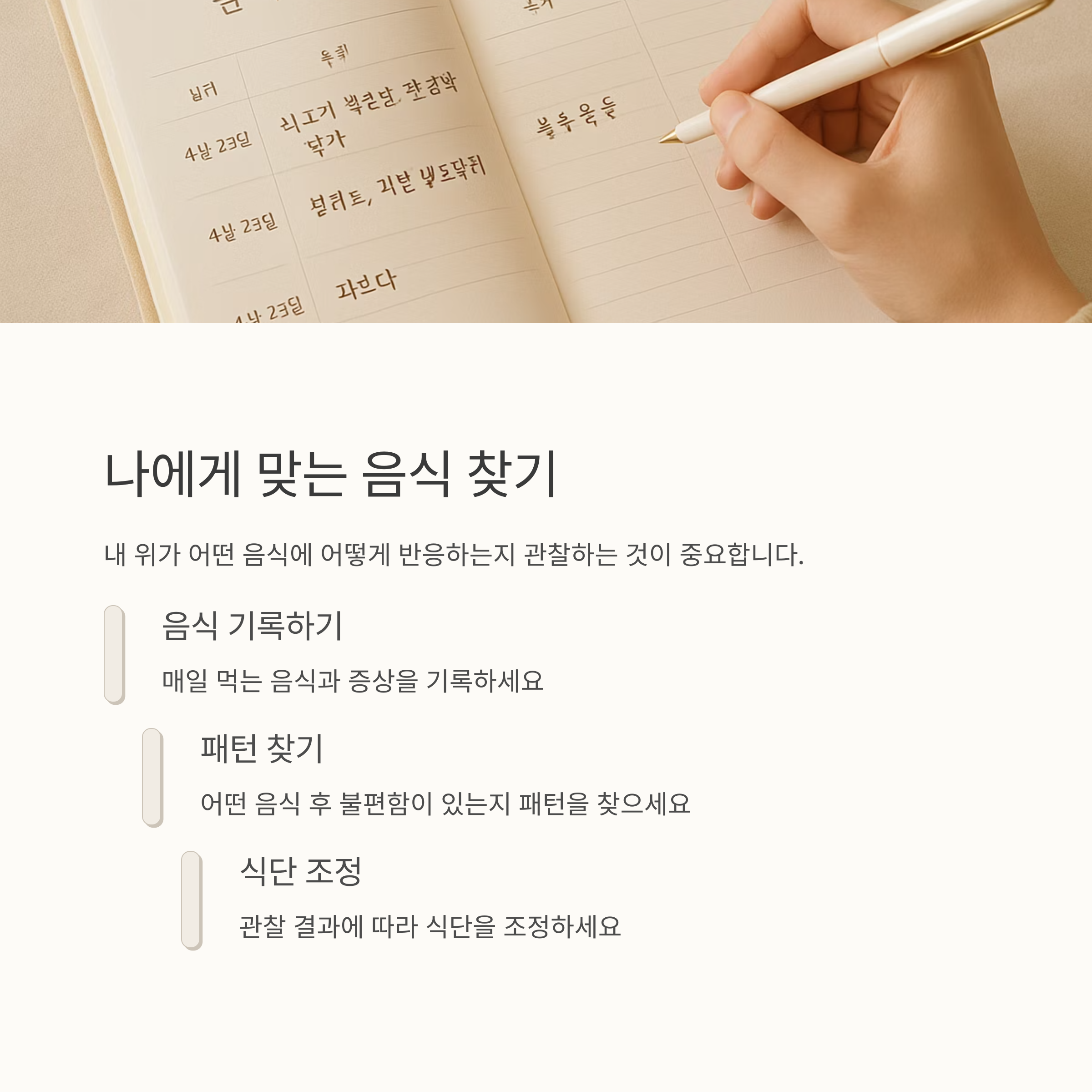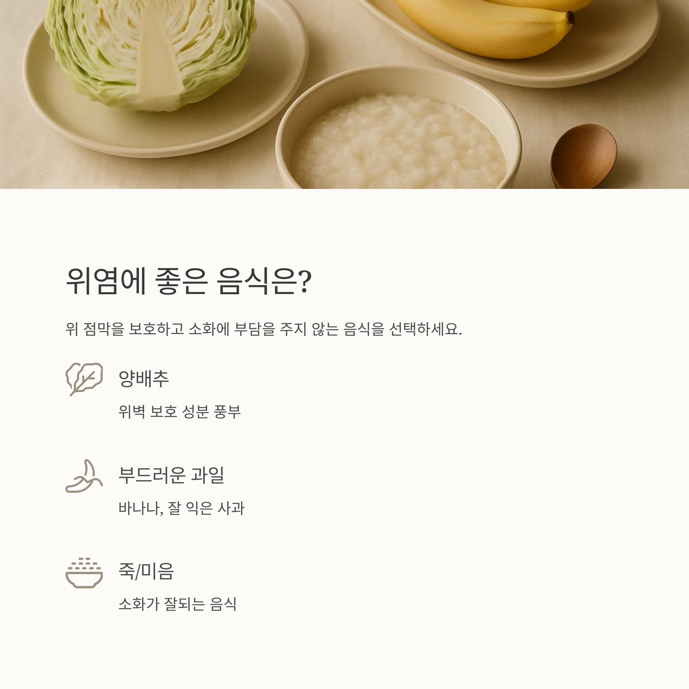 예를 들어 양배추는 위벽 보호에 도움이 되는 성분이 풍부하다는 사실! 그리고 바나나, 잘 익은 사과 같은 부드러운 과일도 위에 자극이 적어요. 또, 흰죽이나 미음처럼 소화가 잘 되는 음식도 위염에 좋답니다. 하지만 중요한 건, '내 위가 어떤 음식에 어떻게 반응하는지'를 관찰하는 거예요. 어떤 음식을 먹었을 때 속이 편안한지, 아니면 불편한지 잘 기록해두면 나에게 맞는 음식을 찾는 데 도움이 될 거예요.