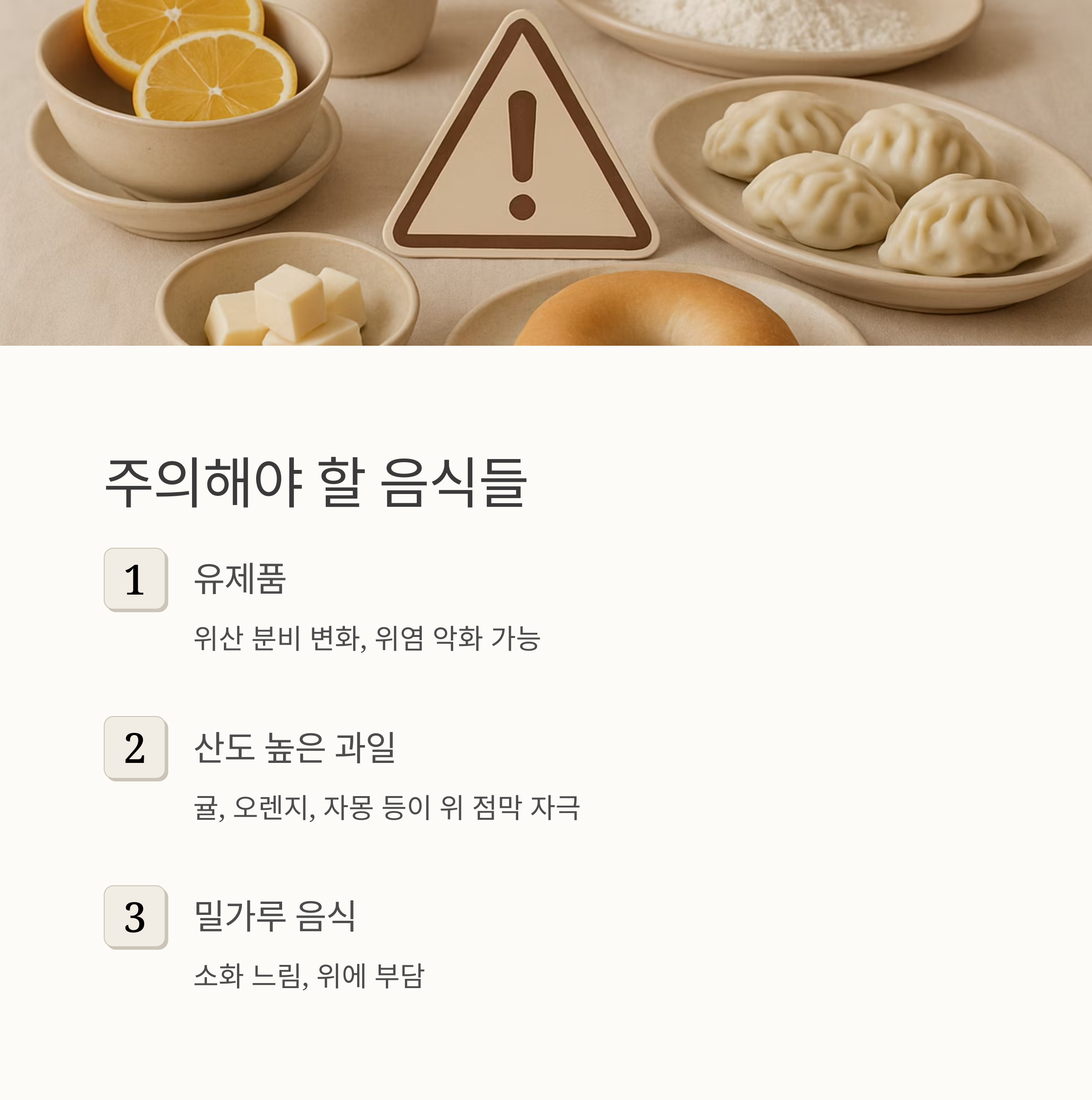 둘째, 공복에 위산을 자극하는 음식은 절대 금지예요. 아침에 일어나자마자 커피를 마시거나 빈속에 매운 음식을 먹는 건 정말 위험해요.