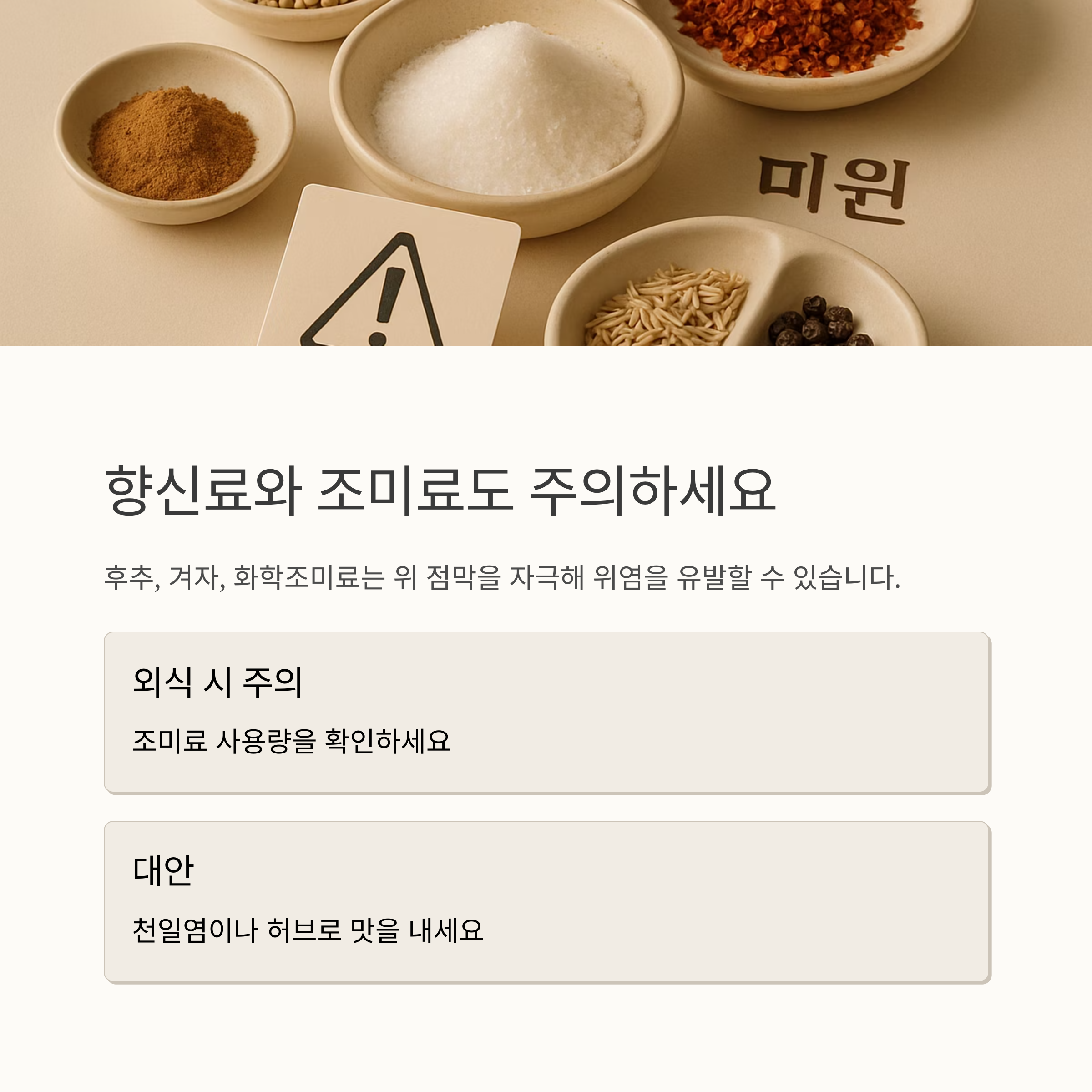 10. 후추, 겨자, 화학조미료처럼 강한 향신료나 조미료도 위 점막을 자극해서 위염을 유발할 수 있어요. 외식할 때 특히 주의해야 하고 천일염이나 허브를 이용해서 음식을 만들어 드시는 것을 추천해요.
