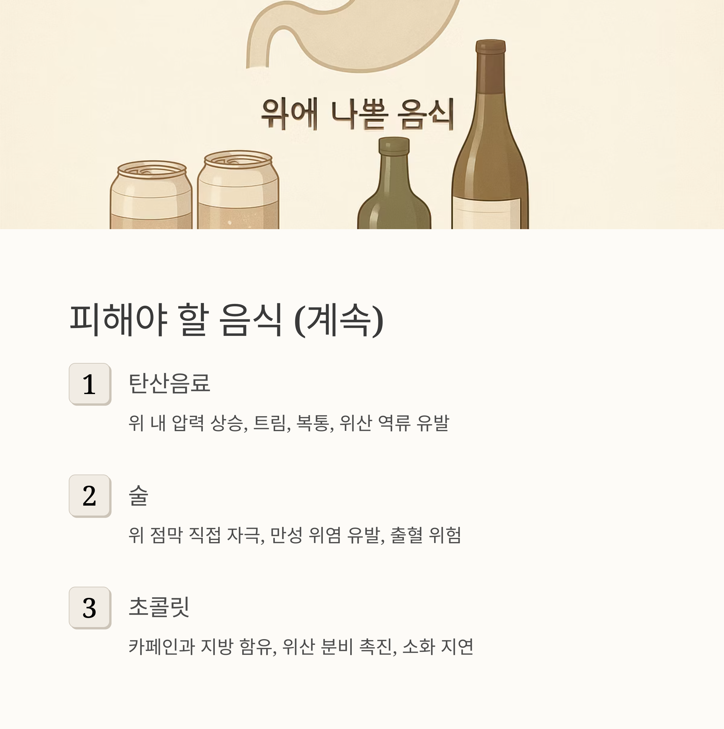 5. 술은 말할 것도 없죠. 위 점막을 직접 자극하고 위염을 만성화시키는 주범이에요. 공복에 술을 마시면 출혈 위험까지 있으니, 위염이 있을 땐 절대 금주하는 게 최고예요!