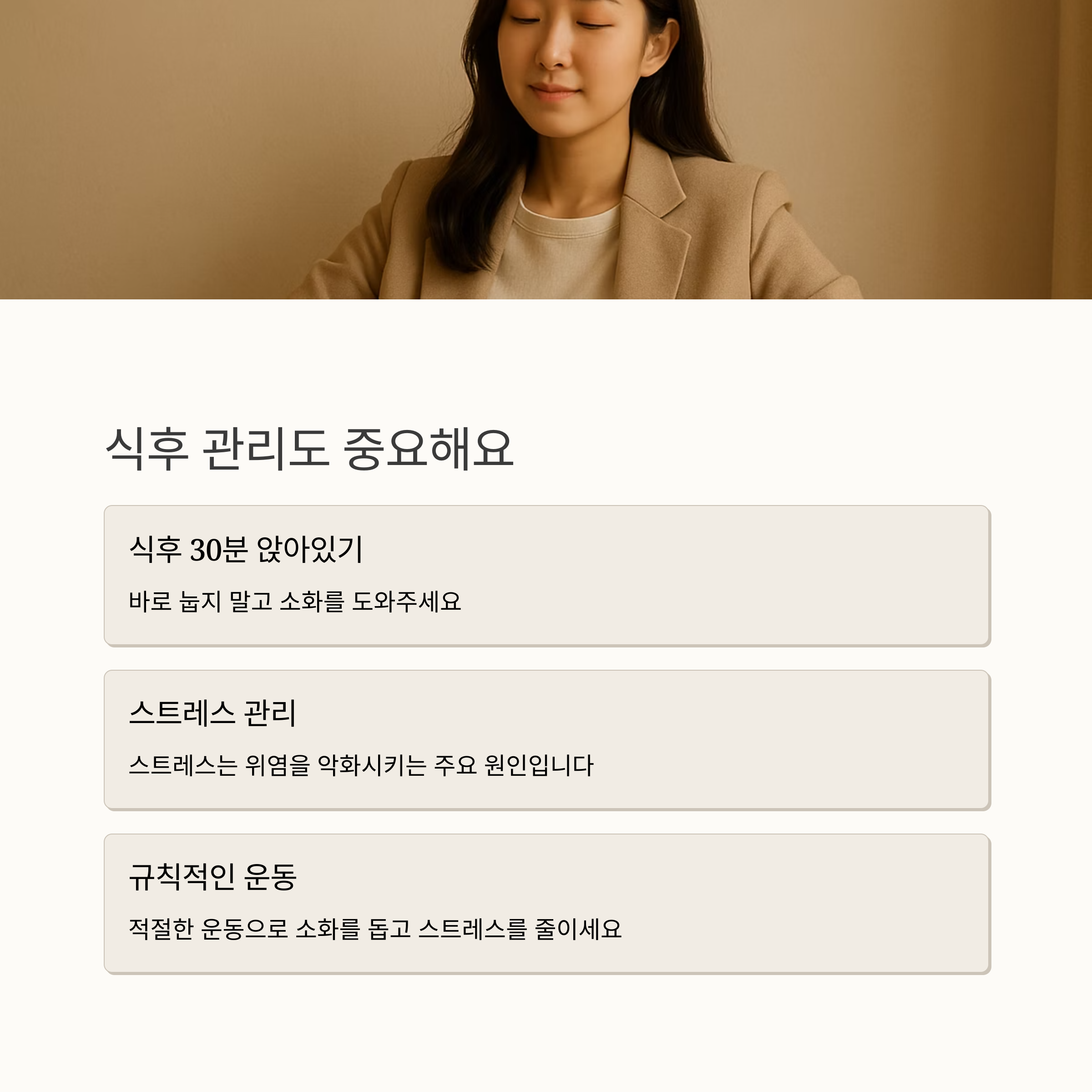 넷째, 식후 바로 눕지 마세요. 식후 30분 정도는 앉아서 소화를 돕는 게 중요해요.