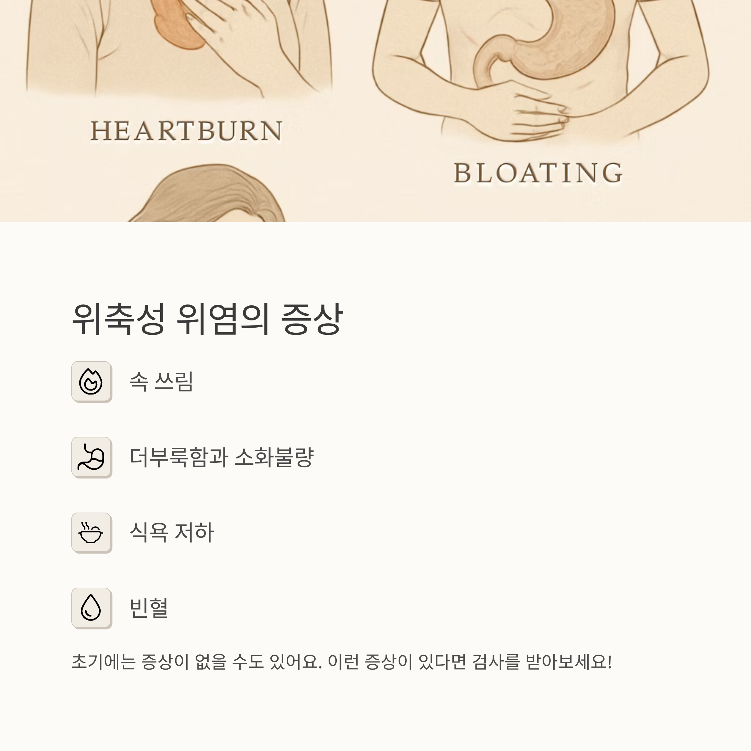 소화가 잘 안 되고 속이 더부룩하고, 심하면 빈혈까지 올 수 있답니다. 게다가, 위축성 위염은 위암으로 발전할 위험이 높아서, 절대 방치해서는 안 돼요. 빨리 병원을 찾아 검사받고 관리하는 게 무엇보다 중요하답니다. 가볍게 생각하지 마시고요!