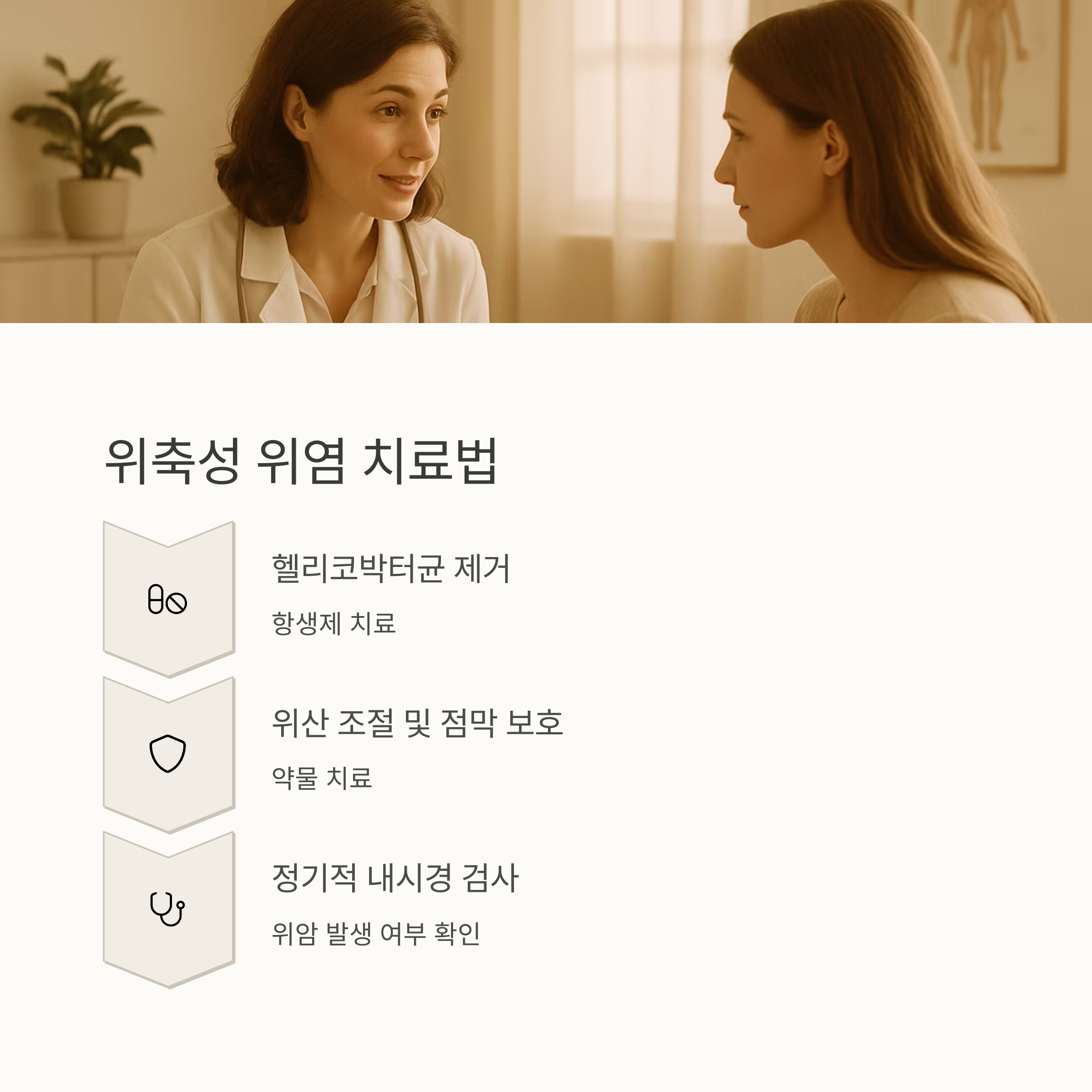 위축성 위염은 완치가 어렵지만, 적절한 치료와 관리를 통해 증상을 완화하고 위암으로의 진행을 막을 수 있어요. 가장 중요한 건 헬리코박터균을 제거하는 것이고요. 약물 치료를 통해 위산 분비를 조절하고 위 점막을 보호할 수 있답니다. 그리고 정기적인 내시경 검사를 통해 위암 발생 여부를 확인해야 해요.
