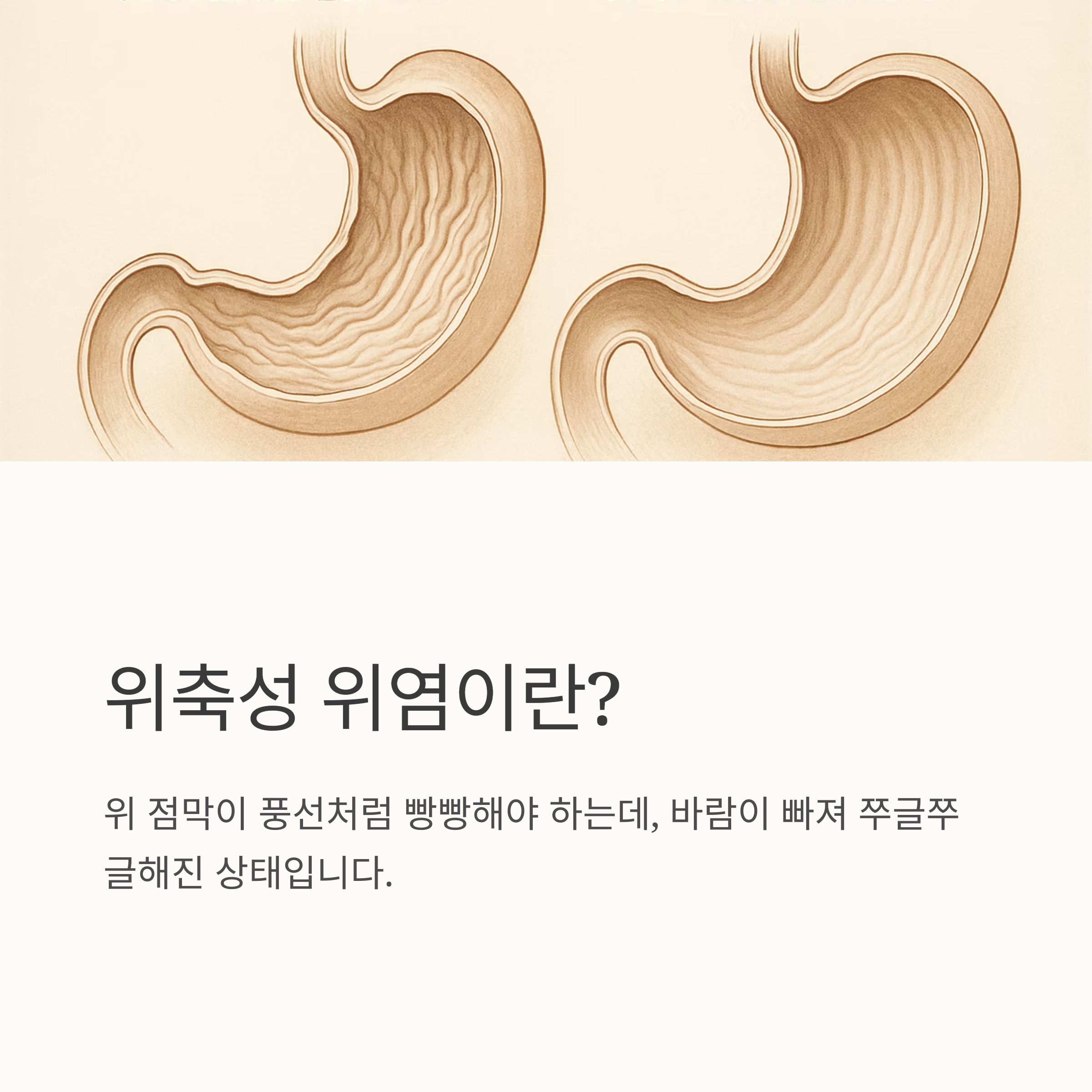 급성 위염은 잠깐 아팠다가 괜찮아지는 반면, 만성 위염은 계속해서 위 점막을 괴롭히는 질환이에요. 그중에서도 위축성 위염은 위 점막이 얇아지면서 제 기능을 못하는 상태인데요, 심각해지면 위암으로 이어질 수도 있어서 꼼꼼히 살펴봐야 해요. 오늘은 위축성 위염에 대해 쉽고 자세하게 알려드릴 테니, 끝까지 함께 해주세요!