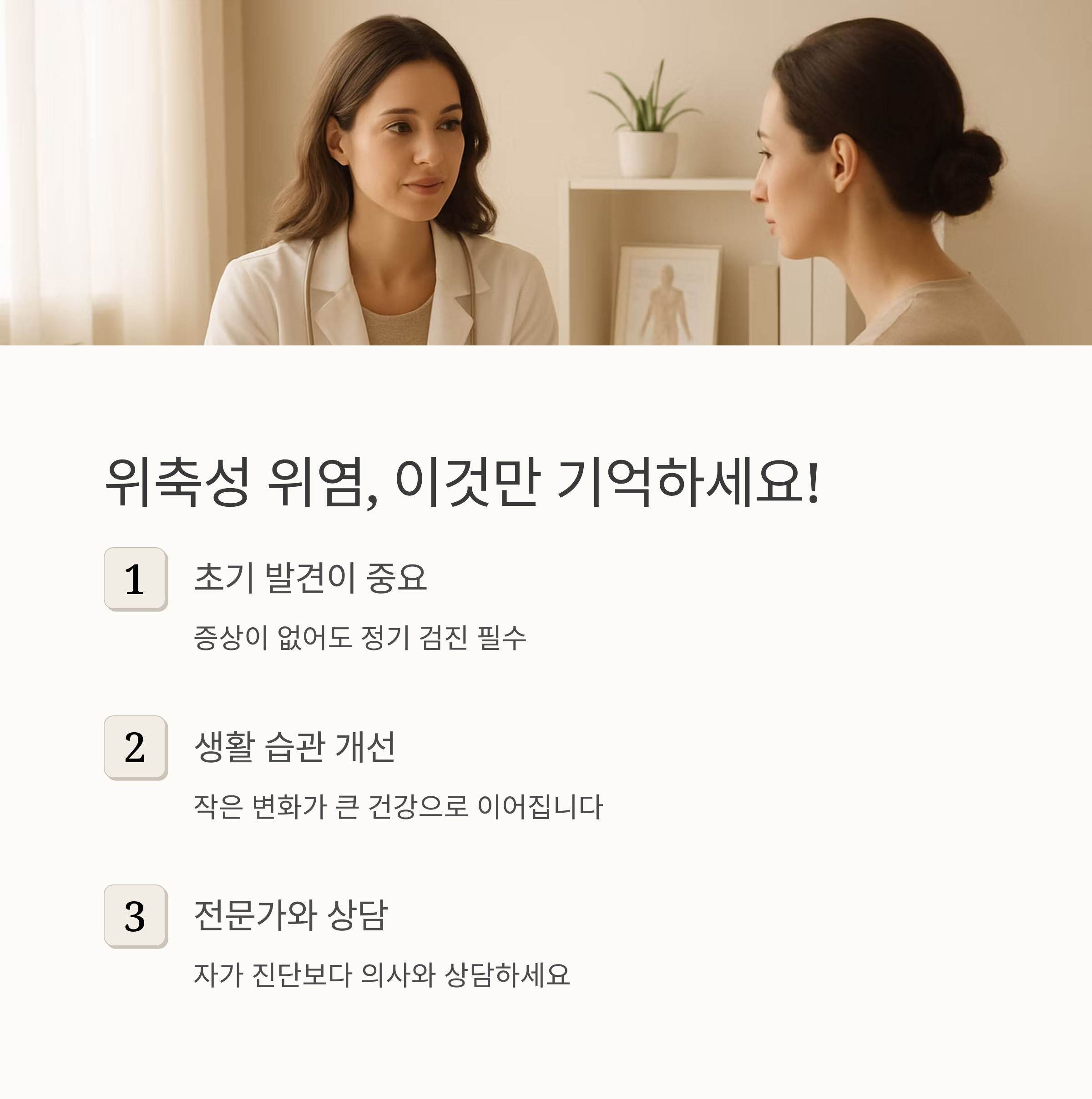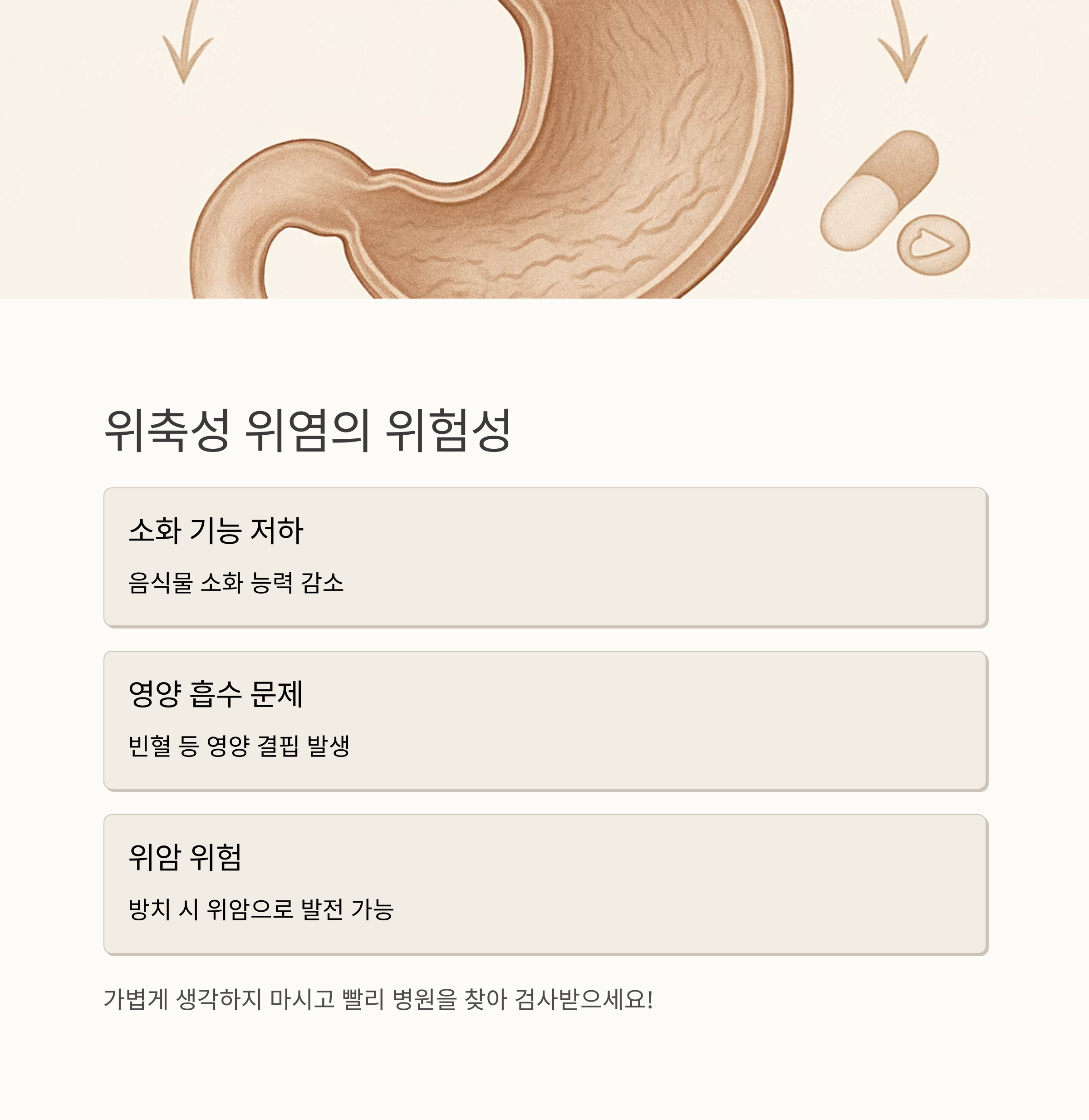 소화가 잘 안 되고 속이 더부룩하고, 심하면 빈혈까지 올 수 있답니다. 게다가, 위축성 위염은 위암으로 발전할 위험이 높아서, 절대 방치해서는 안 돼요. 빨리 병원을 찾아 검사받고 관리하는 게 무엇보다 중요하답니다. 가볍게 생각하지 마시고요!