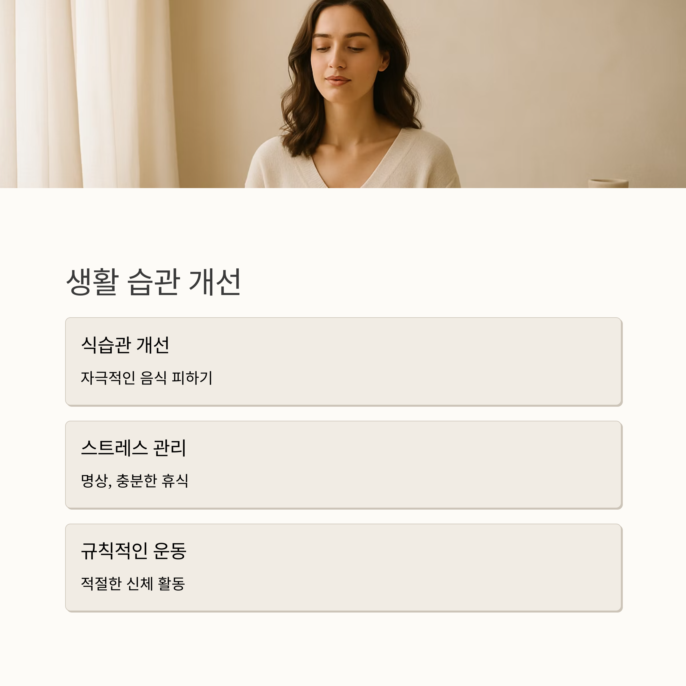 무엇보다 중요한 건 식습관 개선이에요. 자극적인 음식은 피하고, 위에 부담을 주지 않는 부드러운 음식을 섭취하는 것이 좋아요. 스트레스 관리도 매우 중요하고요. 규칙적인 운동과 충분한 수면을 통해 건강한 생활 습관을 유지해야 합니다. 어렵지 않죠?