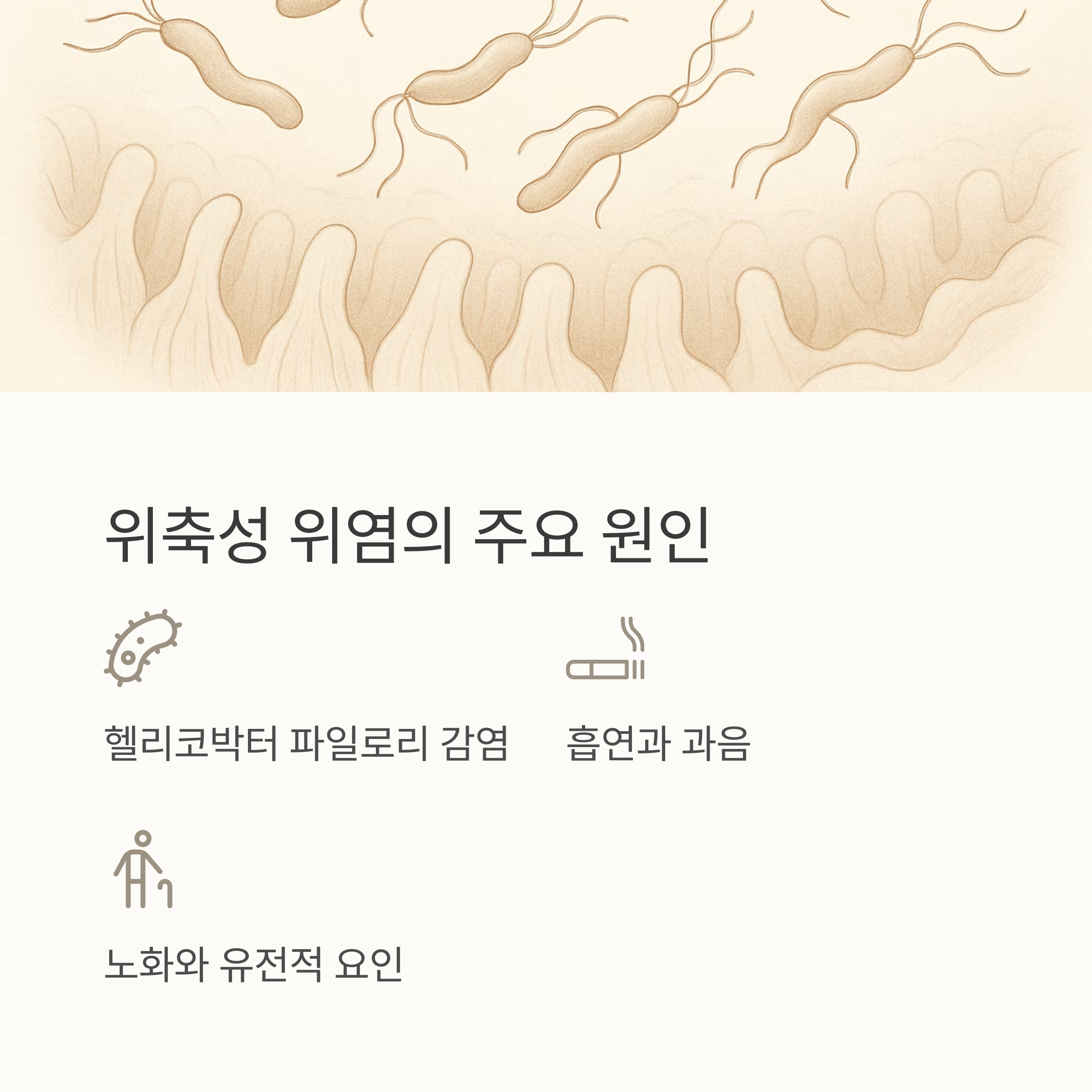 위축성 위염의 가장 흔한 원인은 바로 '헬리코박터 파일로리'라는 세균 감염이에요. 이 세균은 위 점막에 염증을 일으켜서 위축을 유발한답니다. 흡연이나 과음도 위 점막을 자극해서 위축성 위염을 악화시키는 주범 중 하나이고요. 나이가 들면서 위 점막의 재생 능력이 떨어지는 것도 위축성 위염의 원인 중 하나예요.