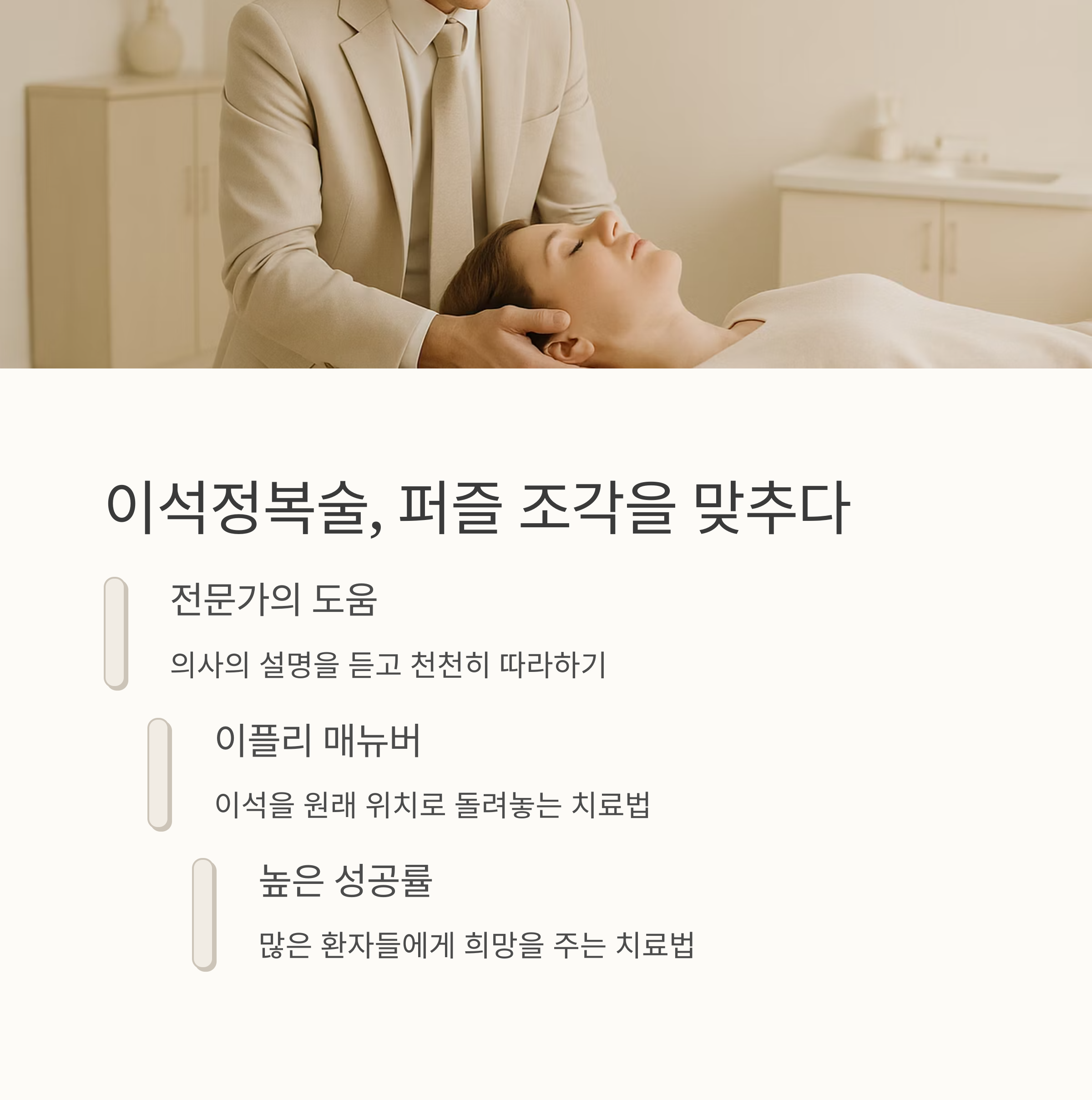 이석증 치료법의 핵심은 바로 이석정복술, 이플리 매뉴버(Epley Maneuver)예요. 이 술은 마치 퍼즐 조각을 제자리에 맞추는 것처럼 이석을 원래 위치로 돌려놓는 역할을 해요. 물론, 전문가의 도움을 받아야 안전하고 효과적이에요. 의사 선생님의 친절한 설명을 듣고, 각 동작을 천천히 따라 하면 돼요.