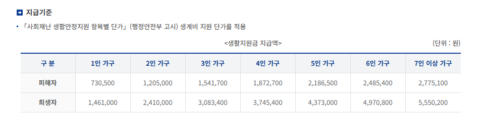 지원금액은 가구 구성원 수에 따라 다르게 책정됩니다. 1인 가구부터 7인 이상 가구까지, 희생자 가족과 피해자 본인에게 지급되는 금액이 각각 다르니, 정확한 금액은 관할 시·군·구청에 문의하거나 관련 홈페이지에서 확인하시는 것이 가장 좋습니다.